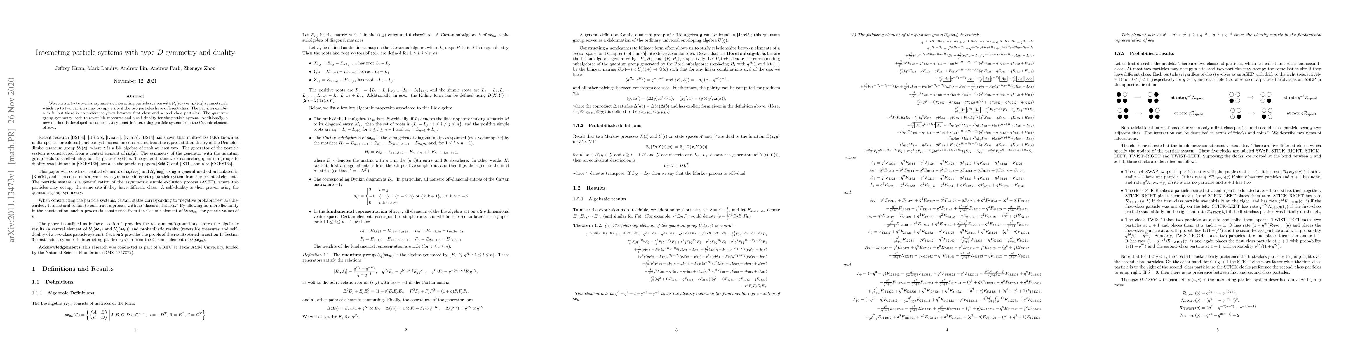 We construct a two-class asymmetric interacting particle system with $U_q(so_6)$ or $U_q(so_8)$ symmetry, in which up to two particles may occupy a site if the two particles have different class. The particles exhibit a drift, but there is no preference given between first-class and second-class particles. The quantum group symmetry leads to reversible measures and a self-duality for the particle system. Additionally, a new method is developed to construct a symmetric interacting particle system from the Casimir element of $so_{2n}$.