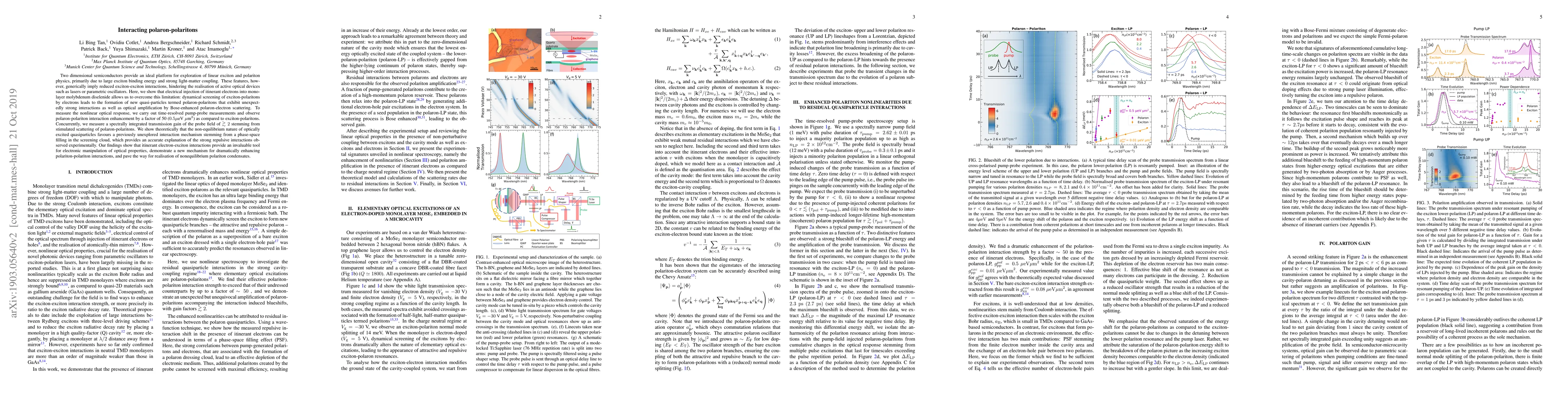 Two dimensional semiconductors provide an ideal platform for exploration of linear exciton and polariton physics, primarily due to large exciton binding energy and strong light-matter coupling. These features, however, generically imply reduced exciton-exciton interactions, hindering the realisation of active optical devices such as lasers or parametric oscillators. Here, we show that electrical injection of itinerant electrons into monolayer molybdenum diselenide allows us to overcome this limitation: dynamical screening of exciton-polaritons by electrons leads to the formation of new quasi-particles termed polaron-polaritons that exhibit unexpectedly strong interactions as well as optical amplification by Bose-enhanced polaron-electron scattering. To measure the nonlinear optical response, we carry out time-resolved pump-probe measurements and observe polaron-polariton interaction enhancement by a factor of 50 ($0.5 \mu$eV $\mu$m$^2$) as compared to exciton-polaritons. Concurrently, we measure a spectrally integrated transmission gain of the probe field of $\gtrsim 2$ stemming from stimulated scattering of polaron-polaritons. We show theoretically that the non-equilibrium nature of optically excited quasiparticles favours a previously unexplored interaction mechanism stemming from a phase-space filling in the screening cloud, which provides an accurate explanation of the strong repulsive interactions observed experimentally. Our findings show that itinerant electron-exciton interactions provide an invaluable tool for electronic manipulation of optical properties, demonstrate a new mechanism for dramatically enhancing polariton-polariton interactions, and pave the way for realisation of nonequilibrium polariton condensates.