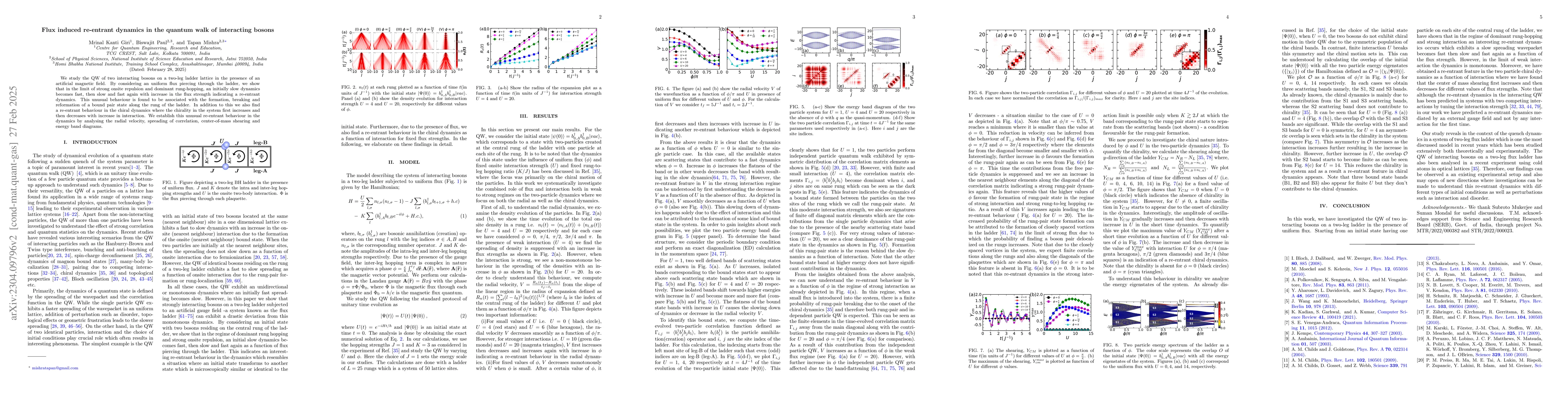 This paper investigates the dynamics of interacting bosons on a two-leg flux ladder under a continuous-time quantum walk, revealing that weak magnetic fields slow down wavefunction spreading, while strong interactions lead to re-entrant dynamics where radial velocity and chiral motion exhibit complex behavior dependent on flux strength and interaction strength.