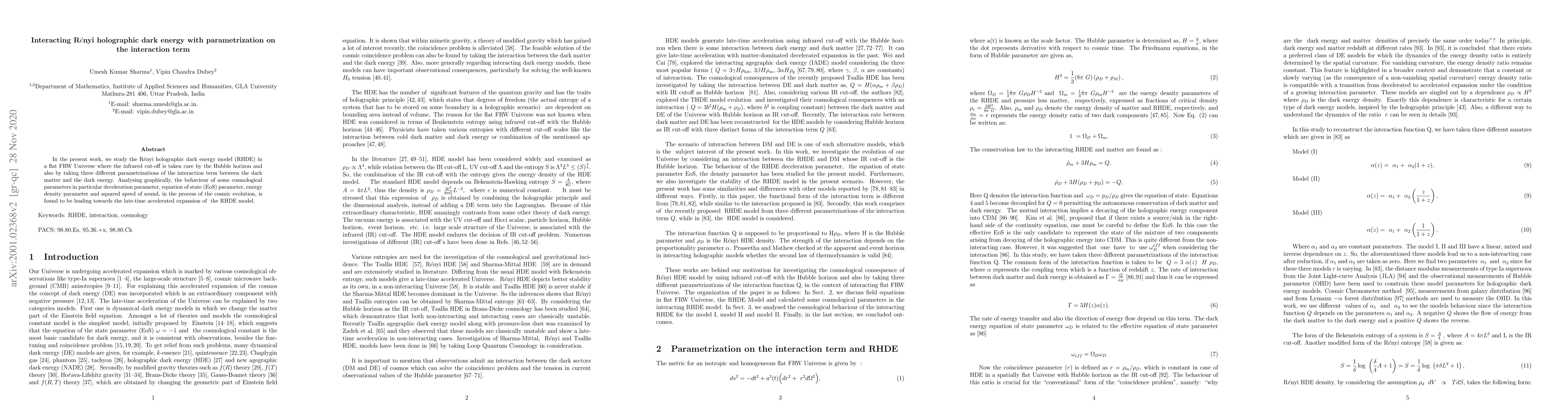In the present work, we study the R$\acute{e}$nyi holographic dark energy model (RHDE) in a flat FRW Universe where the infrared cut-off is taken care by the Hubble horizon and also by taking three different parametrizations of the interaction term between the dark matter and the dark energy. Analyzing graphically, the behavior of some cosmological parameters in particular deceleration parameter, equation of state (EoS) parameter, energy density parameter and squared speed of sound, in the process of the cosmic evolution, is found to be leading towards the late-time accelerated expansion of the RHDE model.
