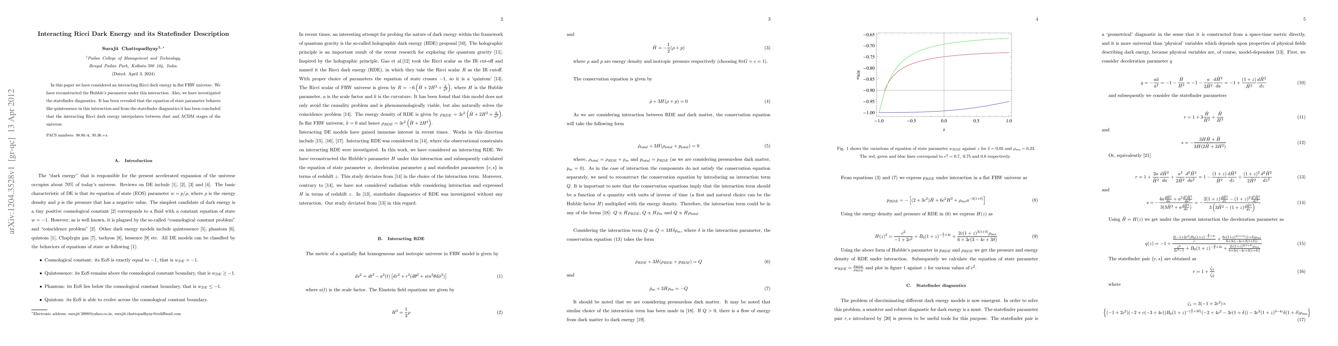 This paper explores interacting Ricci dark energy in a flat FRW universe, reconstructing the Hubble parameter and investigating statefinder diagnostics, revealing that it behaves like quintessence and interpolates between dust and $\Lambda$CDM phases.