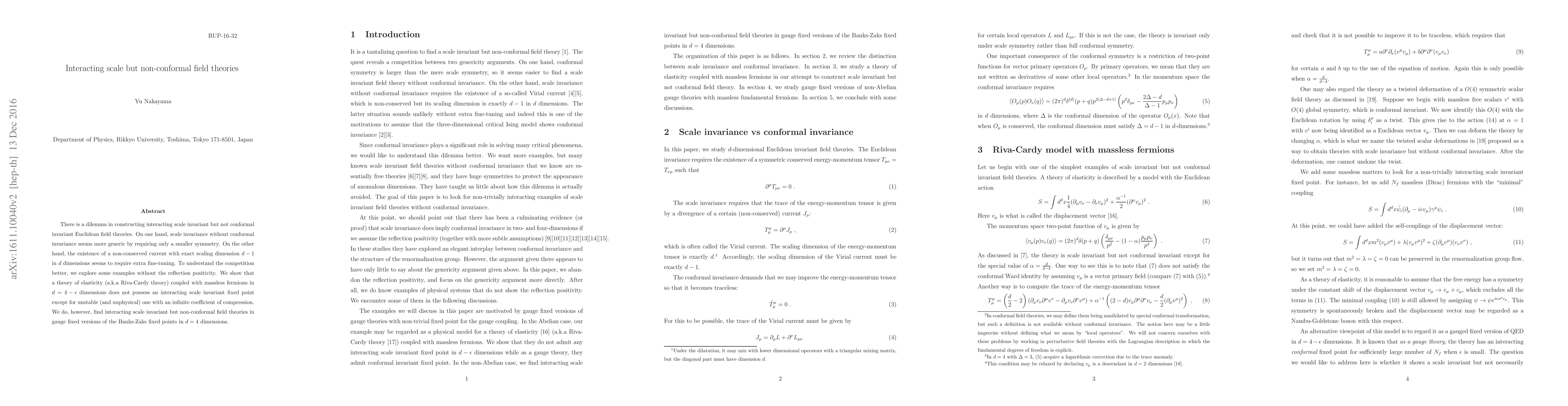 There is a dilemma in constructing interacting scale invariant but not conformal invariant Euclidean field theories. On one hand, scale invariance without conformal invariance seems more generic by requiring only a smaller symmetry. On the other hand, the existence of a non-conserved current with exact scaling dimension $d-1$ in $d$ dimensions seems to require extra fine-tuning. To understand the competition better, we explore some examples without the reflection positivity. We show that a theory of elasticity (a.k.a Riva-Cardy theory) coupled with massless fermions in $d=4-\epsilon$ dimensions does not possess an interacting scale invariant fixed point except for unstable (and unphysical) one with an infinite coefficient of compression. We do, however, find interacting scale invariant but non-conformal field theories in gauge fixed versions of the Banks-Zaks fixed points in $d=4$ dimensions.