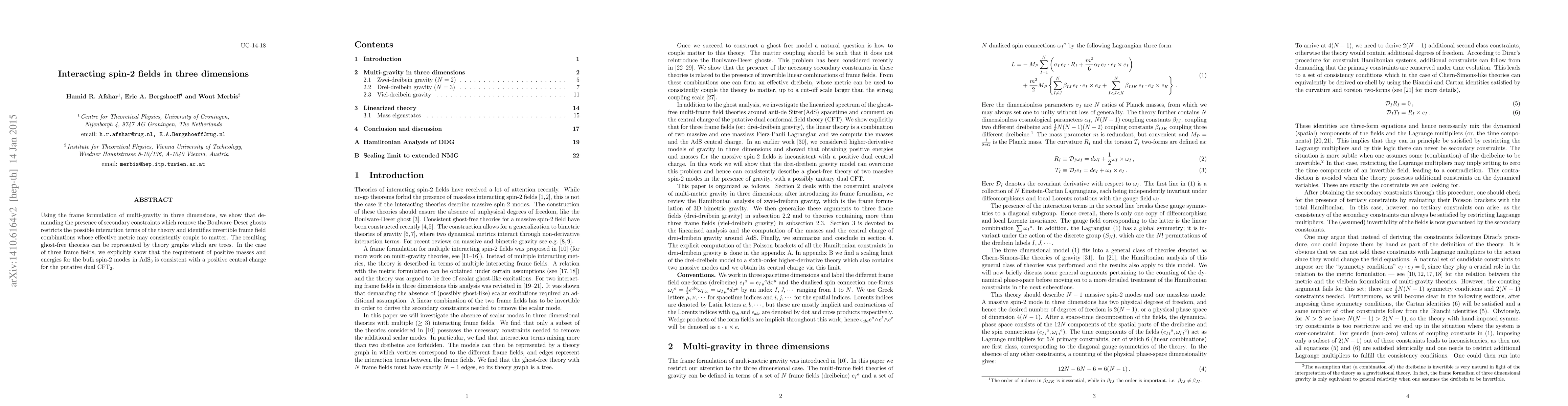 This paper demonstrates that in three-dimensional multi-gravity, secondary constraints eliminating Boulware-Deser ghosts limit interaction terms and identify invertible frame field combinations that can couple to matter without ghosts, represented by tree-structured theory graphs. It also shows that the requirement of positive masses and energies for spin-2 modes in AdS$_3$ aligns with a positive central charge in the dual CFT$_2$.