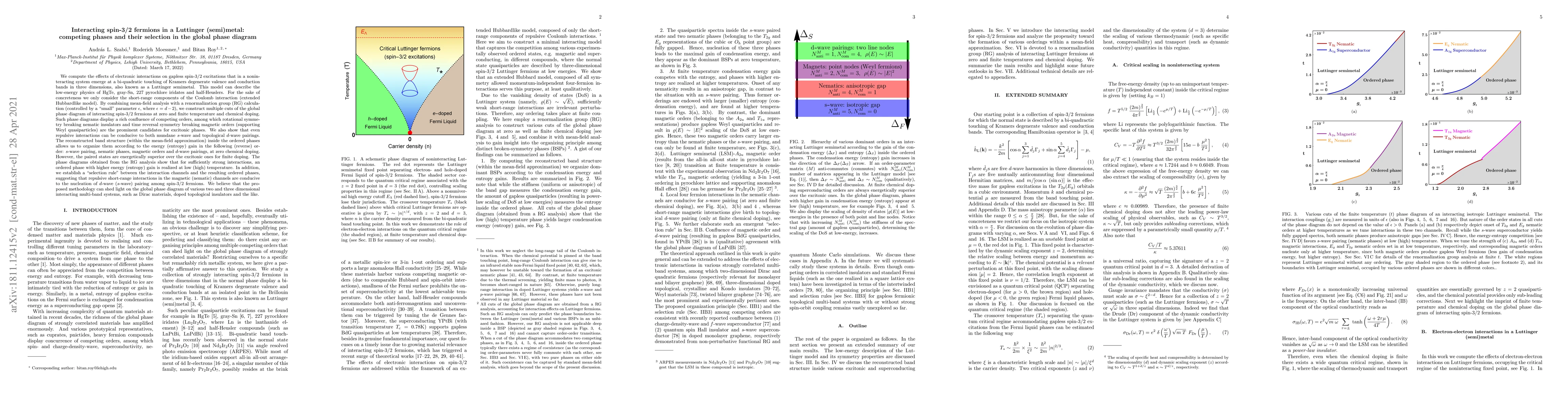 This paper investigates the impact of electronic interactions on spin-3/2 fermions in Luttinger semimetals, revealing a rich variety of competing phases including nematic insulators and magnetic orders. The study combines mean-field analysis with renormalization group calculations to construct phase diagrams, showing that pairing states are energetically favorable over excitonic phases, especially under finite doping.