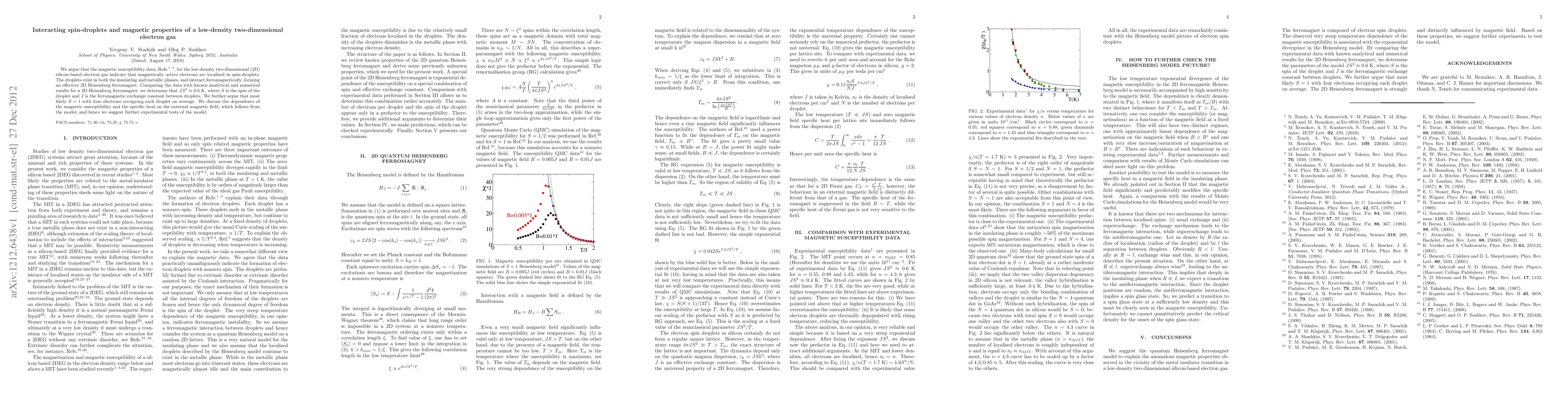 We argue that the magnetic susceptibility data, Refs. 1-3, for the low-density two-dimensional (2D) silicon-based electron gas indicate that magnetically active electrons are localised in spin-droplets. The droplets exist in both the insulating and metallic phases, and interact ferromagnetically, forming an effective 2D Heisenberg ferromagnet. Comparing the data with known analytical and numerical results for a 2D Heisenberg ferromagnet, we determine that JS^2 \approx 0.6K, where S is the spin of the droplet and J is the ferromagnetic exchange constant between droplets. We further argue that most likely S=1 with four electrons occupying each droplet on average. We discuss the dependence of the magnetic susceptibility and the specific heat on the external magnetic field, which follows from the model, and hence we suggest further experimental tests of the model.