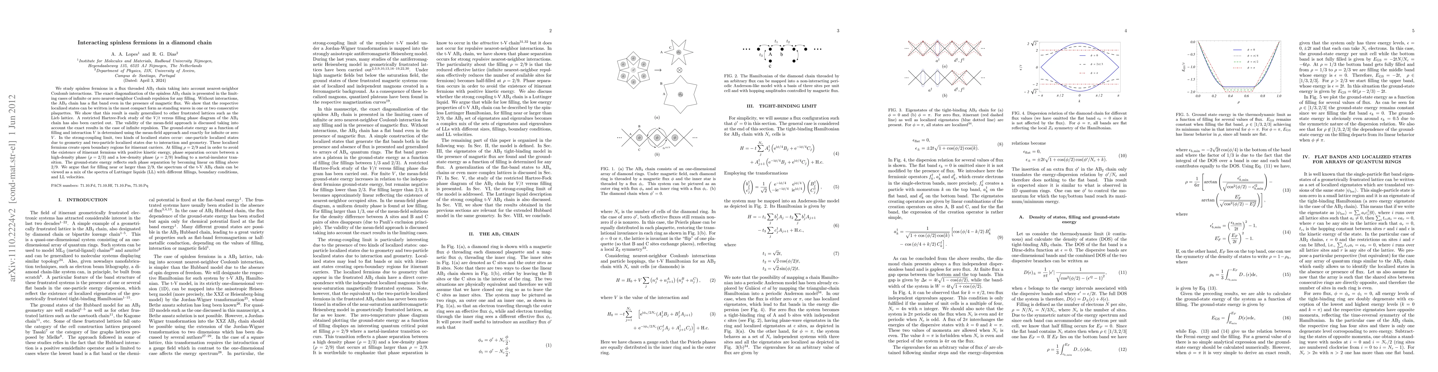 We study spinless fermions in a flux threaded AB$_2$ chain taking into account nearest-neighbor Coulomb interactions. The exact diagonalization of the spinless AB$_2$ chain is presented in the limiting cases of infinite or zero nearest-neighbor Coulomb repulsion for any filling. Without interactions, the AB$_2$ chain has a flat band even in the presence of magnetic flux. We show that the respective localized states can be written in the most compact form as standing waves in one or two consecutive plaquettes. We show that this result is easily generalized to other frustrated lattices such as the Lieb lattice. A restricted Hartree-Fock study of the $V/t$ versus filling phase diagram of the AB$_2$ chain has also been carried out. The validity of the mean-field approach is discussed taking into account the exact results in the case of infinite repulsion. The ground-state energy as a function of filling and interaction $V$ is determined using the mean-field approach and exactly for infinite or zero $V$. In the strong-coupling limit, two kinds of localized states occur: one-particle localized states due to geometry and two-particle localized states due to interaction and geometry. These localized fermions create open boundary regions for itinerant carriers. At filling $\rho=2/9$ and in order to avoid the existence of itinerant fermions with positive kinetic energy, phase separation occurs between a high-density phase ($\rho=2/3$) and a low-density phase ($\rho=2/9$) leading to a metal-insulator transition. The ground-state energy reflects such phase separation by becoming linear on filling above 2/9. We argue that for filling near or larger than 2/9, the spectrum of the t-V AB$_2$ chain can be viewed as a mix of the spectra of Luttinger liquids (LL) with different fillings, boundary conditions, and LL velocities.