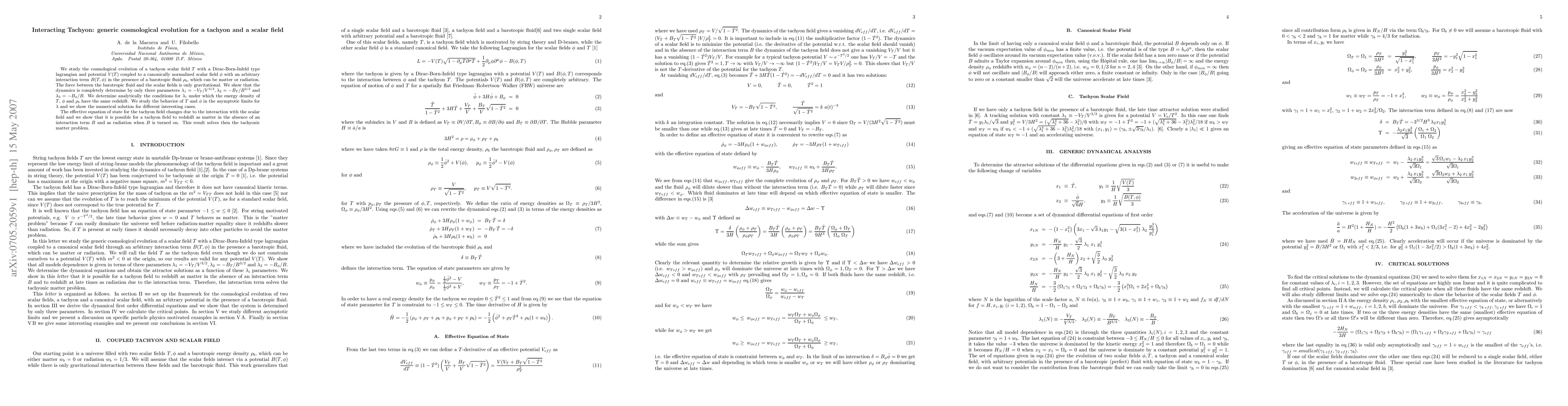 We study the cosmological evolution of a tachyon scalar field T with a Dirac-Born-Infeld type lagrangian and potential V(T) coupled to a canonically normalized scalar field \phi with an arbitrary interaction term B(T,\phi) in the presence of a barotropic fluid $\rb$, which can be matter or radiation. The force between the barotropic fluid and the scalar fields is only gravitational. We show that the dynamics is completely determine by only three parameters L1 = - V_T/ V^{3/2}, L2= - B_T /B^{3/2} and L3 =-B_{\phi}/B. We determine analytically theconditions for $\lm_i$ under which the energy density of T, \phi and $\rb$ have the same redshift. We study the behavior of T and \phi in the asymptotic limits for L_i and we show the numerical solution for different interesting cases. The effective equation of state for the tachyon field changes due to the interaction with the scalar field and we show that it is possible for a tachyon field to redshift as matter in the absence of an interaction term B and as radiation when B is turned on. This result solves then the tachyonic matter problem.