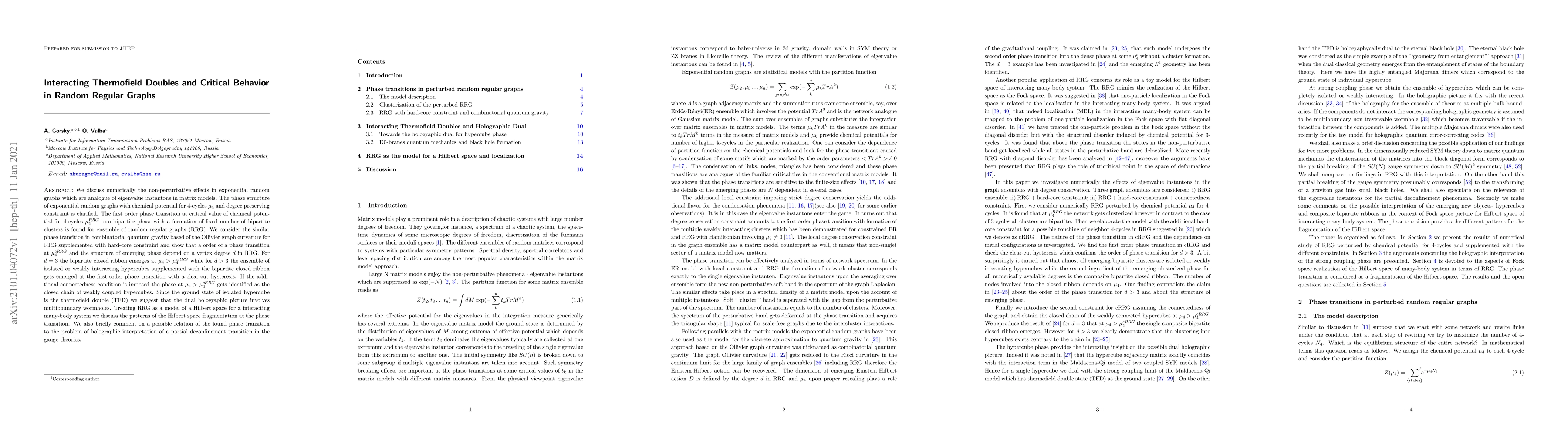 We discuss numerically the non-perturbative effects in exponential random graphs which are analogue of eigenvalue instantons in matrix models. The phase structure of exponential random graphs with chemical potential for 4-cycles and degree preserving constraint is clarified. The first order phase transition at critical value of chemical potential for 4-cycles into bipartite phase with a formation of fixed number of bipartite clusters is found for ensemble of random regular graphs (RRG). We consider the similar phase transition in combinatorial quantum gravity based of the Ollivier graph curvature for RRG supplemented with hard-core constraint and show that a order of a phase transition and the structure of emerging phase depend on a vertex degree d in RRG. For d = 3 the bipartite closed ribbon emerges at bipartite phase while for d > 3 the ensemble of isolated or weakly interacting hypercubes supplemented with the bipartite closed ribbon gets emerged at the first order phase transition with a clear-cut hysteresis. If the additional connectedness condition is imposed the bipartite phase gets identified as the closed chain of weakly coupled hypercubes. Since the ground state of isolated hypercube is the thermofield double (TFD) we suggest that the dual holographic picture involves multiboundary wormholes. Treating RRG as a model of a Hilbert space for a interacting many-body system we discuss the patterns of the Hilbert space fragmentation at the phase transition. We also briefly comment on a possible relation of the found phase transition to the problem of holographic interpretation of a partial deconfinement transition in the gauge theories.