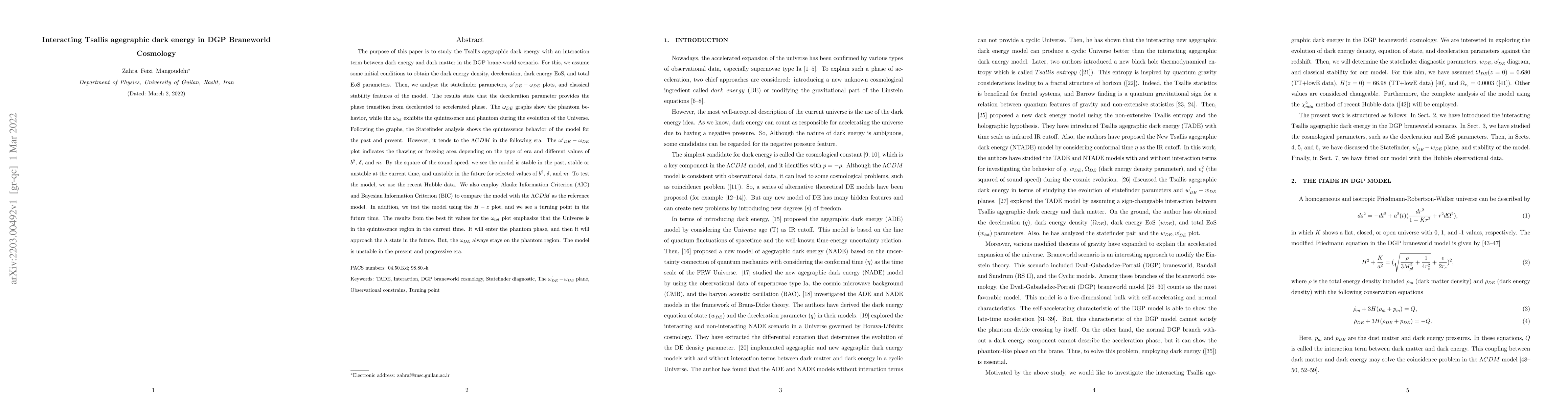 The purpose of this paper is to study the Tsallis agegraphic dark energy with an interaction term between dark energy and dark matter in the DGP brane-world scenario. For this, we assume some initial conditions to obtain the dark energy density, deceleration, dark energy EoS, and total EoS parameters. Then, we analyze the statefinder parameters, $\omega'{}_{DE}-\omega_{DE}$ plots, and classical stability features of the model. The results state that the deceleration parameter provides the phase transition from decelerated to accelerated phase. The $\omega_{DE}$ graphs show the phantom behavior, while the $\omega_{tot}$ exhibits the quintessence and phantom during the evolution of the Universe. Following the graphs, the Statefinder analysis shows the quintessence behavior of the model for the past and present. However, it tends to the $\Lambda CDM$ in the following era. The $\omega'{}_{DE}-\omega_{DE}$ plot indicates the thawing or freezing area depending on the type of era and different values of $b^{2}$, $\delta$, and $m$. By the square of the sound speed, we see the model is stable in the past, stable or unstable at the current time, and unstable in the future for selected values of $b^{2}$, $\delta$, and $m$. To test the model, we use the recent Hubble data. We also employ Akaike Information Criterion (AIC) and Bayesian Information Criterion (BIC) to compare the model with the $\Lambda CDM$ as the reference model. In addition, we test the model using the $H-z$ plot, and we see a turning point in the future time. The results from the best fit values for the $\omega_{tot}$ plot emphasize that the Universe is in the quintessence region in the current time. It will enter the phantom phase, and then it will approach the $\Lambda$ state in the future. But, the $\omega_{DE}$ always stays on the phantom region. The model is unstable in the present and progressive era.
