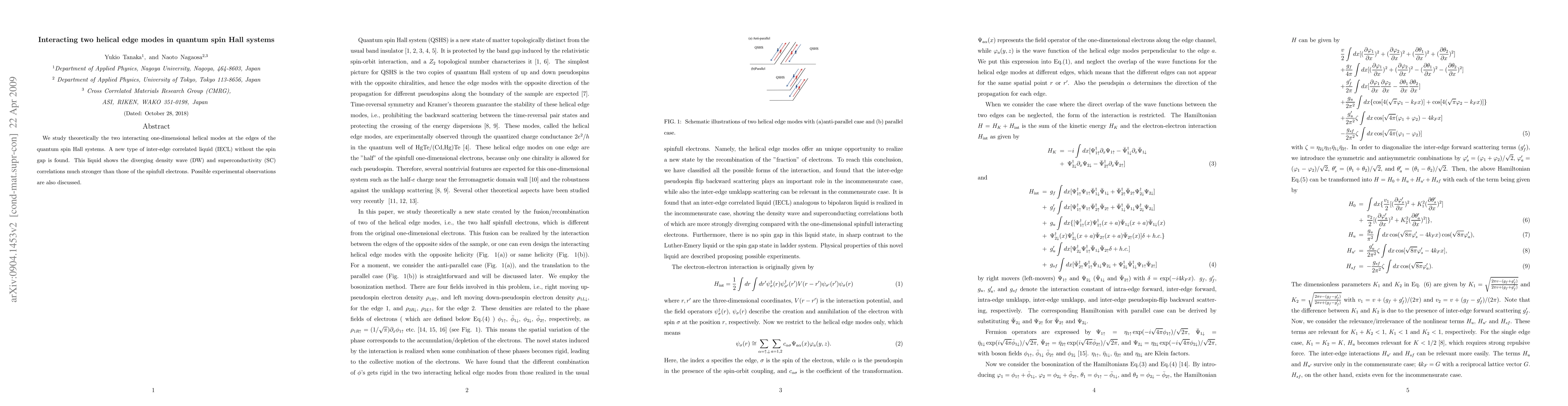 We study theoretically the two interacting one-dimensional helical modes at the edges of the quantum spin Hall systems. A new type of inter-edge correlated liquid (IECL) without the spin gap is found. This liquid shows the diverging density wave (DW) and superconductivity (SC) correlations much stronger than those of the spinfull electrons. Possible experimental observations are also discussed.