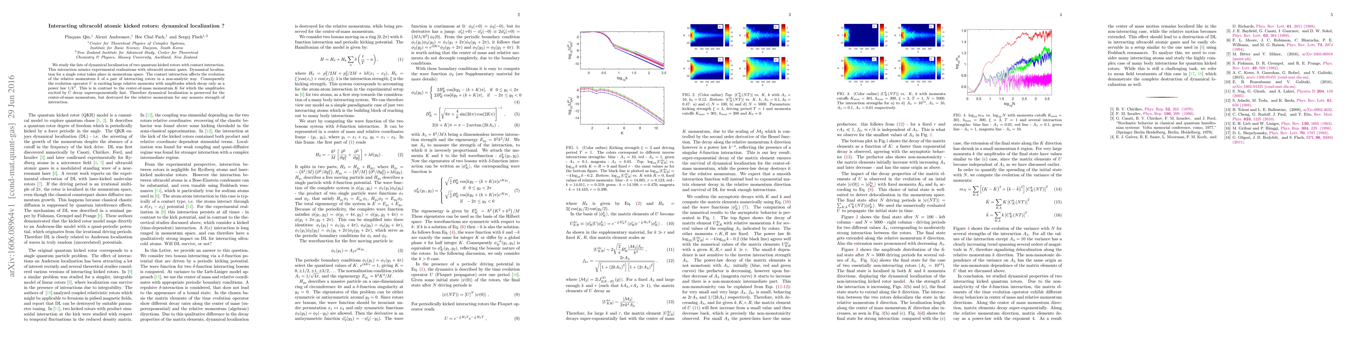 This study investigates dynamical localization in two interacting quantum kicked rotors, similar to ultracold atomic gases, finding that while localization is preserved for the center-of-mass momentum, it is destroyed for the relative momentum due to the non-analytic effects of contact interaction.