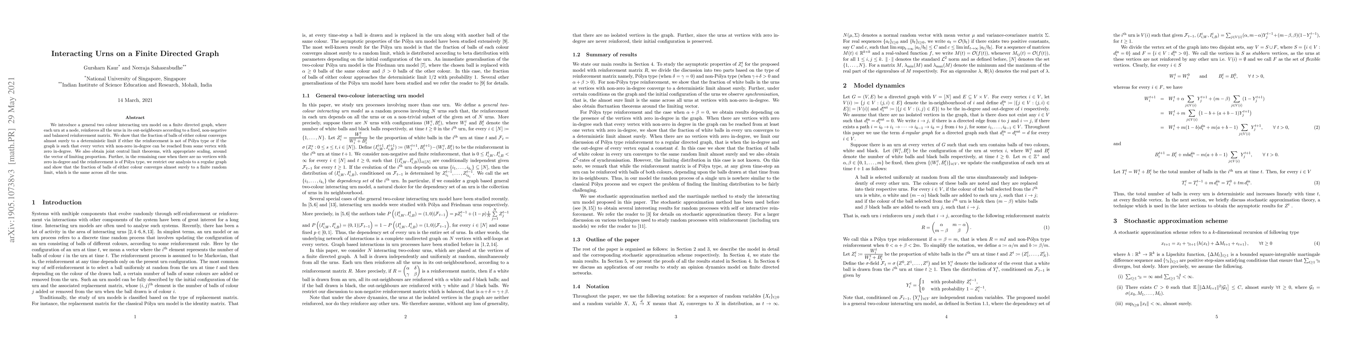 The paper establishes almost sure convergence and synchronization results for interacting urn models on finite directed graphs, introducing conditions under which limiting behavior can be deterministic or random, depending on the reinforcement type and graph structure.