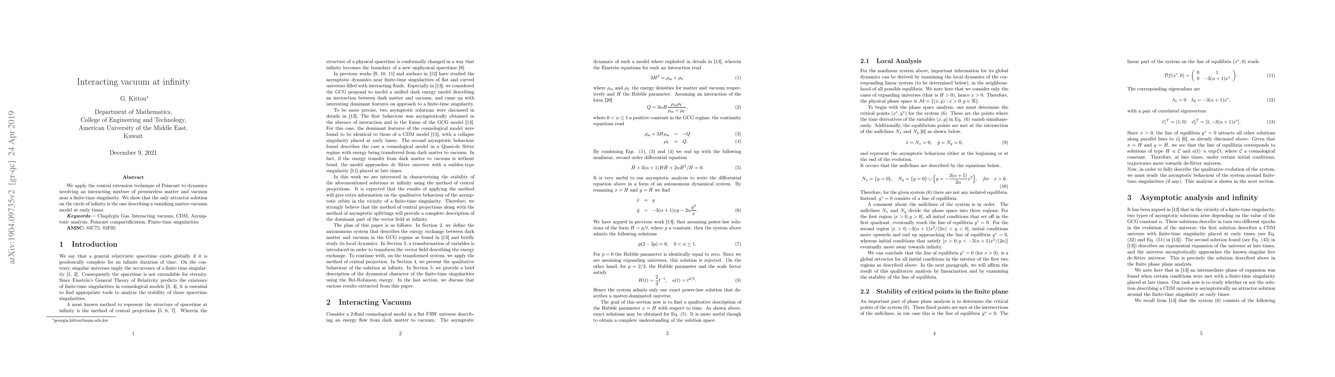 We apply the central extension technique of Poincare to dynamics involving an interacting mixture of pressureless matter and vacuum near a finite-time singularity. We show that the only attractor solution on the circle of infinity is the one describing a vanishing matter-vacuum model at early times