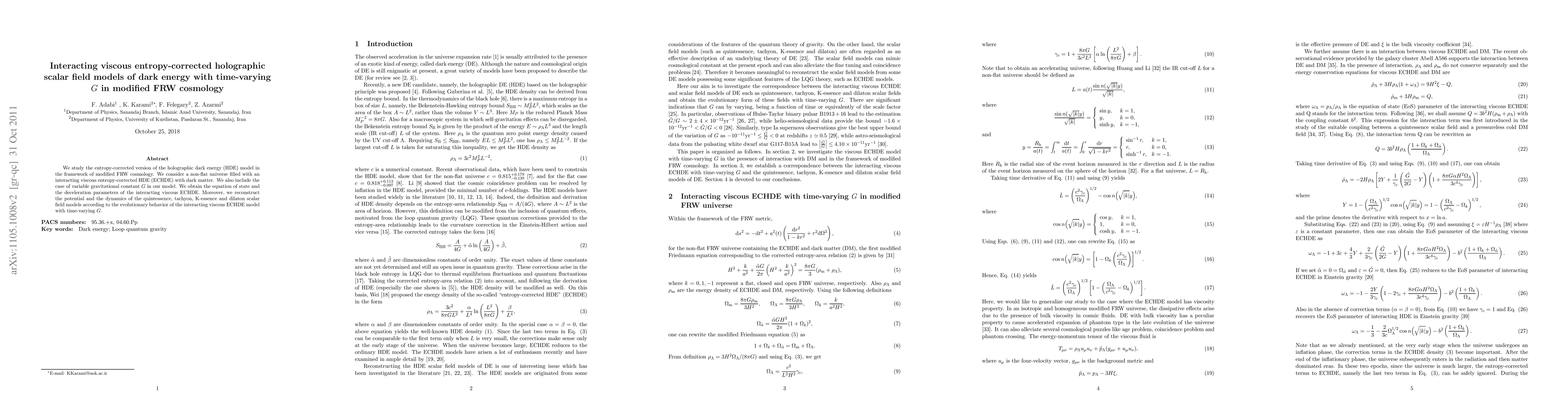 This paper explores an entropy-corrected holographic dark energy model in modified Friedmann-Roberts-Walker (FRW) cosmology, incorporating an interacting viscous component and a variable gravitational constant G. The study derives the equation of state and deceleration parameters for this model and reconstructs the dynamics of various scalar field models based on the model's evolutionary behavior.