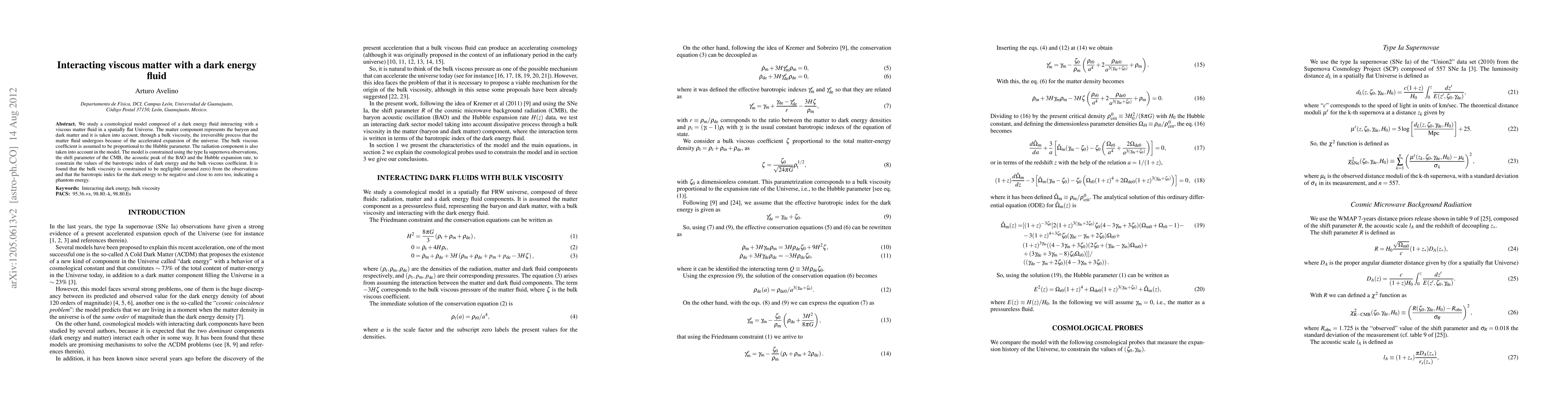 We study a cosmological model composed of a dark energy fluid interacting with a viscous matter fluid in a spatially flat Universe. The matter component represents the baryon and dark matter and it is taken into account, through a bulk viscosity, the irreversible process that the matter fluid undergoes because of the accelerated expansion of the universe. The bulk viscous coefficient is assumed to be proportional to the Hubble parameter. The radiation component is also taken into account in the model. The model is constrained using the type Ia supernova observations, the shift parameter of the CMB, the acoustic peak of the BAO and the Hubble expansion rate, to constrain the values of the barotropic index of dark energy and the bulk viscous coefficient. It is found that the bulk viscosity is constrained to be negligible (around zero) from the observations and that the barotropic index for the dark energy to be negative and close to zero too, indicating a phantom energy.