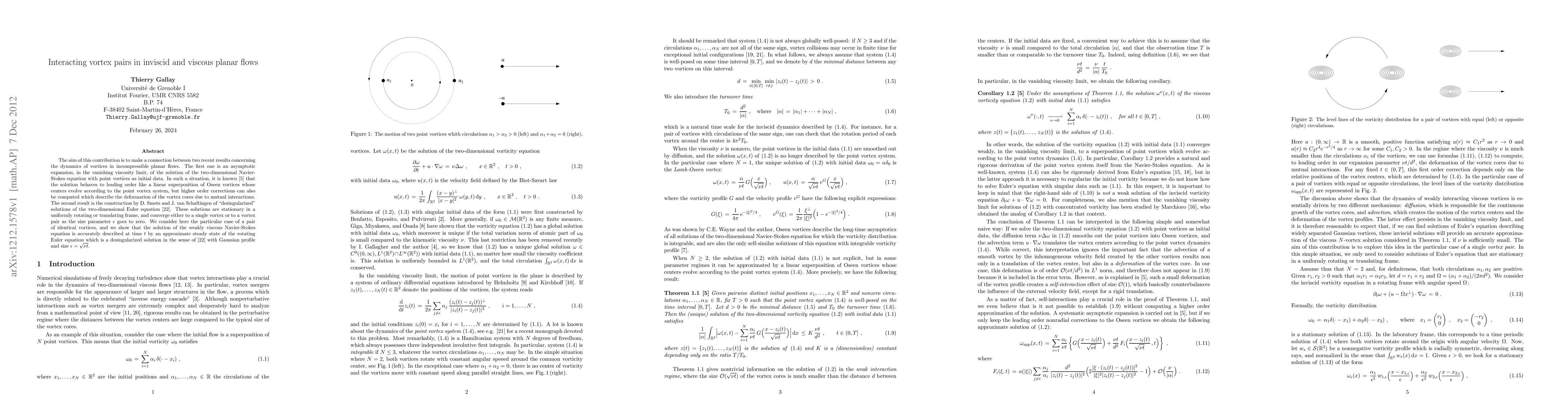 This paper connects the dynamics of interacting vortex pairs in inviscid and viscous planar flows, showing that weakly viscous Navier-Stokes solutions approximate steady states of desingularized Euler equations, with vortex cores evolving as Gaussian profiles scaling with time.