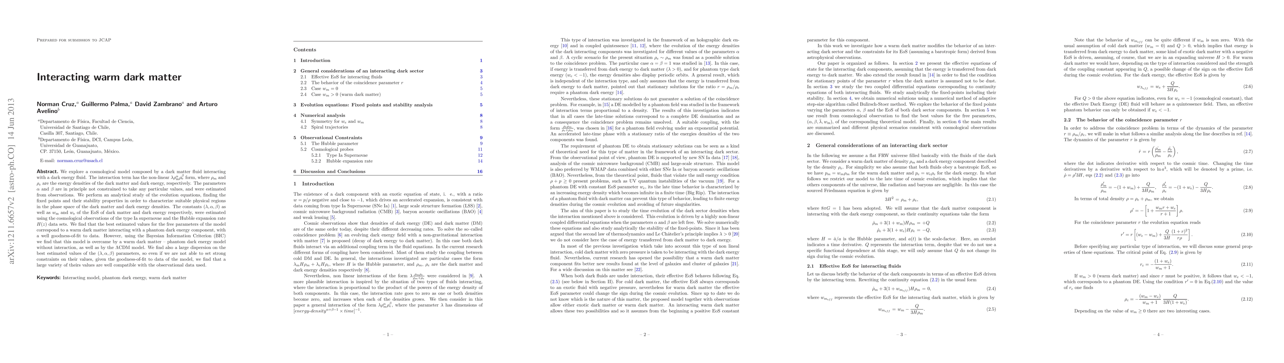 This paper investigates a cosmological model where interacting warm dark matter and dark energy influence each other, estimating parameters using observational data. The model's best fit corresponds to warm dark matter interacting with phantom dark energy, though it is outperformed by non-interacting models and the standard LCDM model. The study highlights a wide compatibility range for the interaction parameters despite large dispersion.