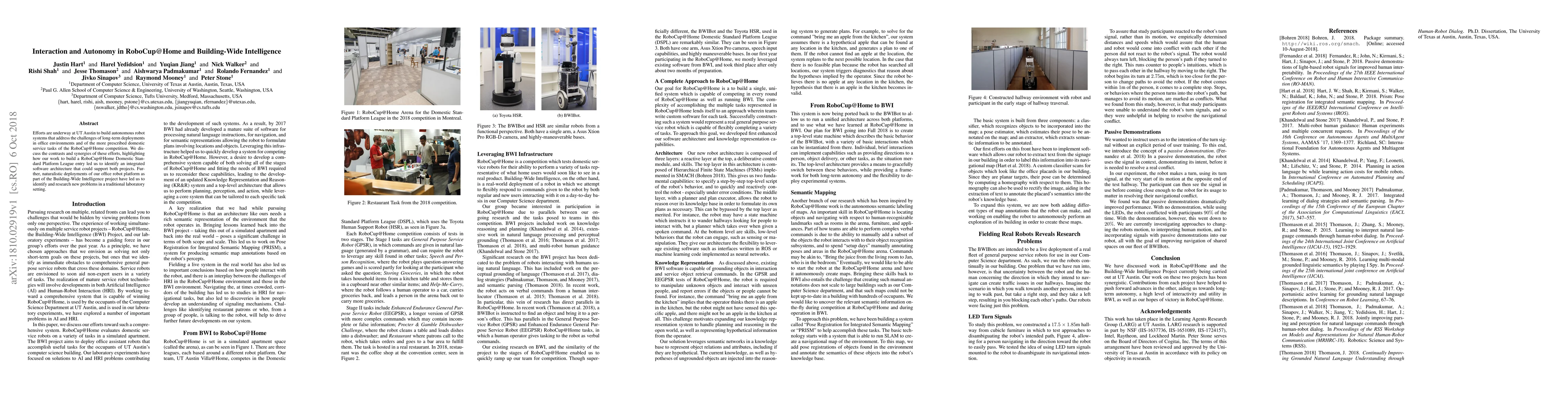 Researchers at UT Austin developed an integrated software architecture to support both RoboCup@Home and Building-Wide Intelligence projects, highlighting the challenges and synergies of long-term robot deployments in office environments and domestic settings.