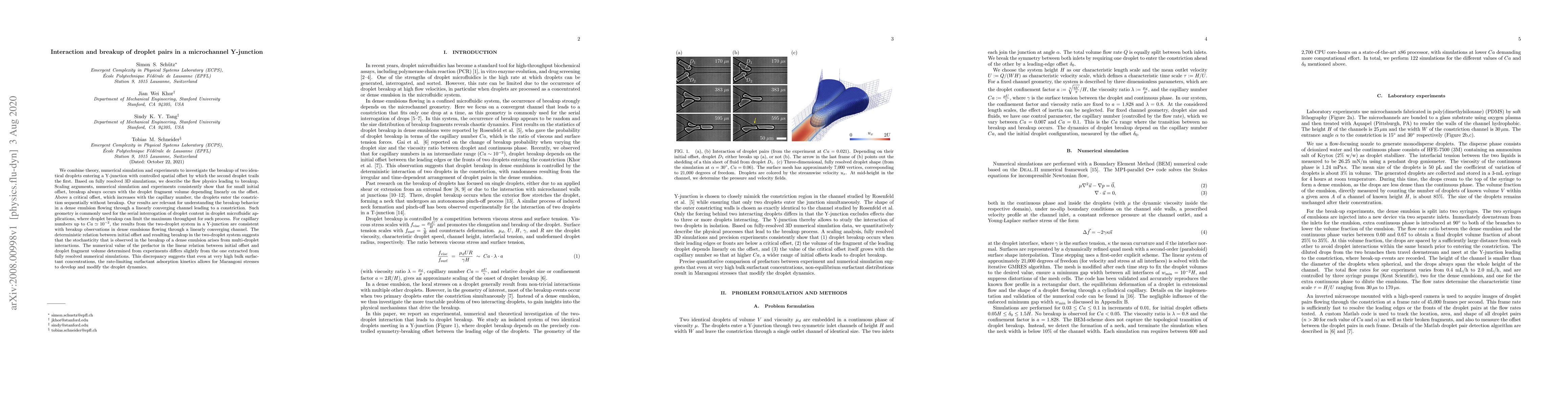 This study combines theory, numerical simulations, and experiments to explore the breakup of droplet pairs in a microchannel Y-junction, revealing that small initial offsets lead to consistent breakup, while larger offsets result in sequential entry without breakup. The findings highlight the importance of initial droplet offset and capillary number in determining breakup behavior, which is crucial for understanding dense emulsion dynamics in microfluidic applications.