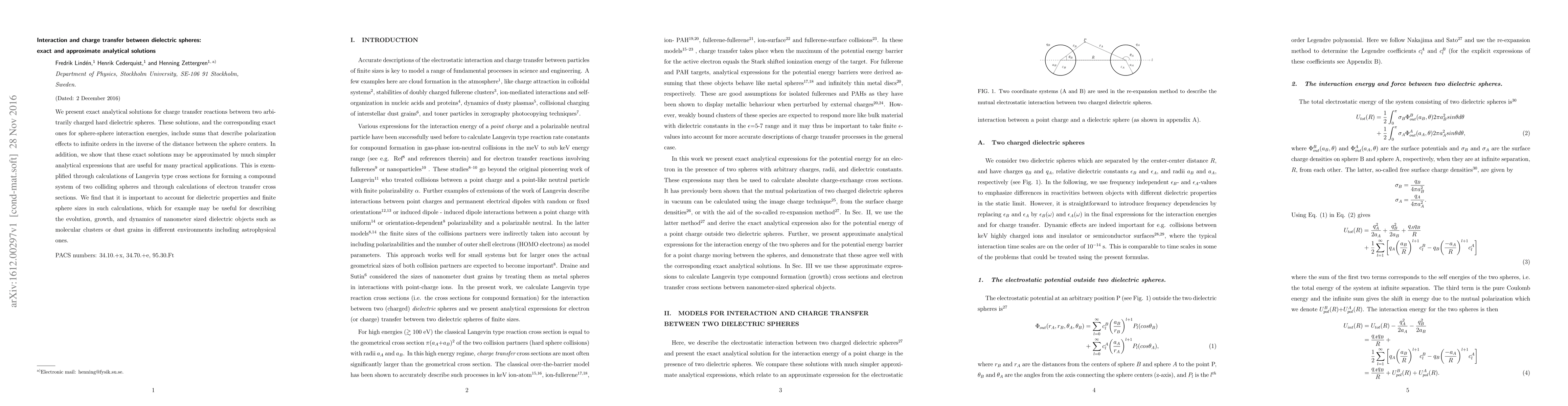 Researchers have developed exact analytical solutions for charge transfer reactions between dielectric spheres, which can accurately describe polarization effects and are useful for studying nanometer-sized objects in various environments.