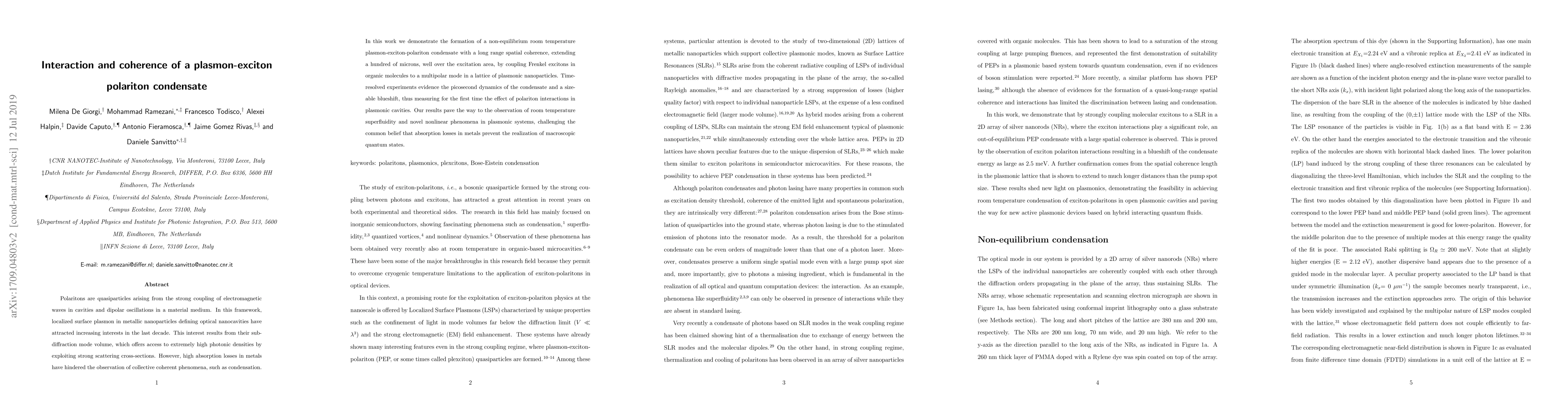 Polaritons are quasiparticles arising from the strong coupling of electromagnetic waves in cavities and dipolar oscillations in a material medium. In this framework, localized surface plasmon in metallic nanoparticles defining optical nanocavities have attracted increasing interests in the last decade. This interest results from their sub-diffraction mode volume, which offers access to extremely high photonic densities by exploiting strong scattering cross-sections. However, high absorption losses in metals have hindered the observation of collective coherent phenomena, such as condensation. In this work we demonstrate the formation of a non-equilibrium room temperature plasmon-exciton-polariton condensate with a long range spatial coherence, extending a hundred of microns, well over the excitation area, by coupling Frenkel excitons in organic molecules to a multipolar mode in a lattice of plasmonic nanoparticles. Time-resolved experiments evidence the picosecond dynamics of the condensate and a sizeable blueshift, thus measuring for the first time the effect of polariton interactions in plasmonic cavities. Our results pave the way to the observation of room temperature superfluidity and novel nonlinear phenomena in plasmonic systems, challenging the common belief that absorption losses in metals prevent the realization of macroscopic quantum states.