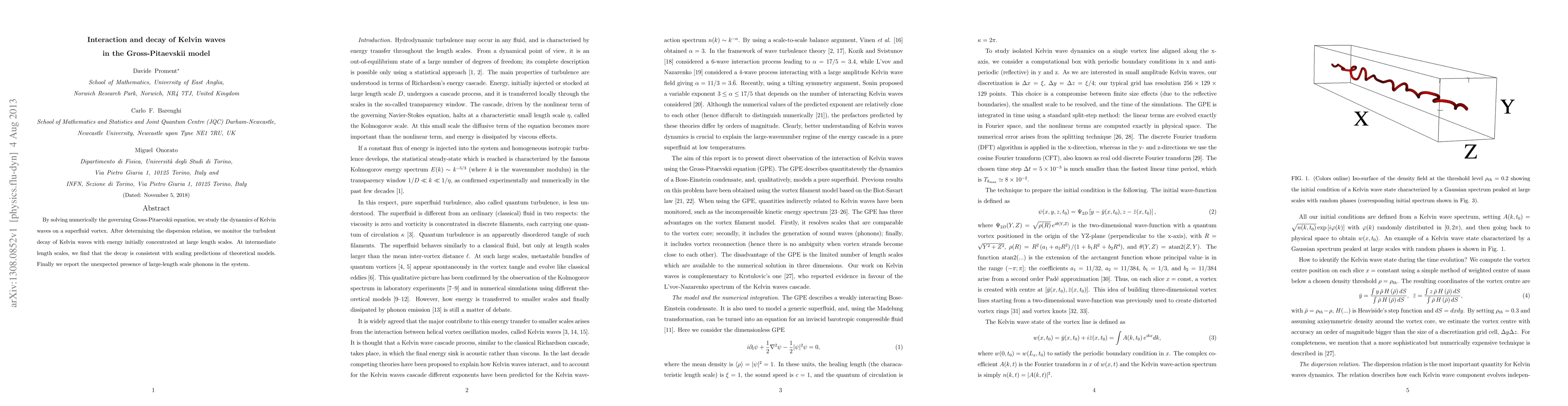 This study numerically investigates the dynamics of Kelvin waves on a superfluid vortex using the Gross-Pitaevskii equation, revealing turbulent decay consistent with theoretical predictions at intermediate scales and the unexpected emergence of large-length scale phonons.