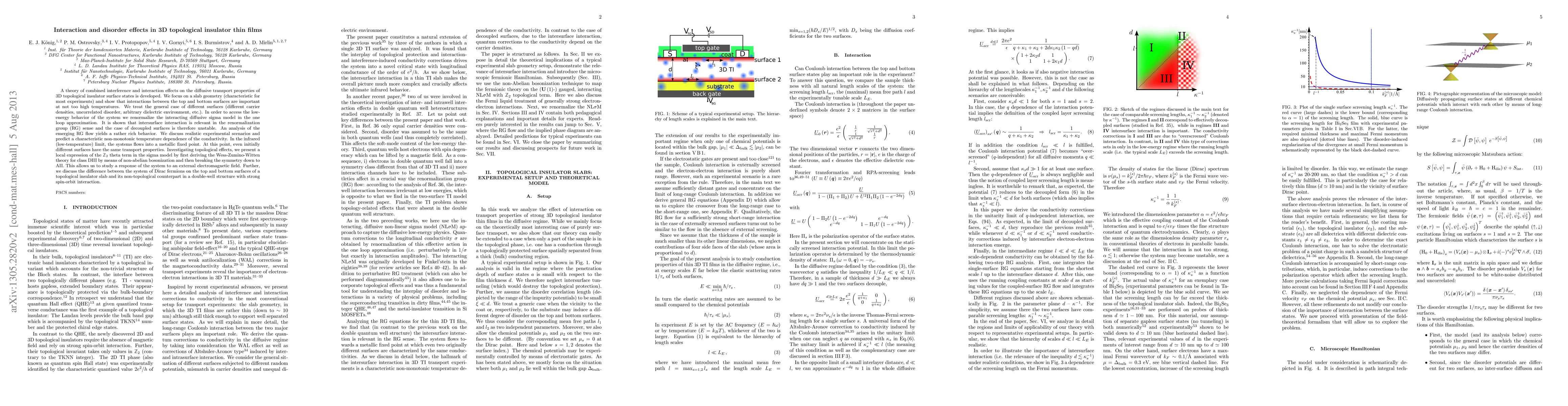 A theory of combined interference and interaction effects on the diffusive transport properties of 3D topological insulator surface states is developed. We focus on a slab geometry (characteristic for most experiments) and show that interactions between the top and bottom surfaces are important at not too high temperatures. We treat the general case of different surfaces (different carrier densities, uncorrelated disorder, arbitrary dielectric environment, etc.). In order to access the low-energy behavior of the system we renormalize the interacting diffusive sigma model in the one loop approximation. It is shown that intersurface interaction is relevant in the renormalization group (RG) sense and the case of decoupled surfaces is therefore unstable. An analysis of the emerging RG flow yields a rather rich behavior. We discuss realistic experimental scenarios and predict a characteristic non-monotonic temperature dependence of the conductivity. In the infrared (low-temperature) limit, the systems flows into a metallic fixed point. At this point, even initially different surfaces have the same transport properties. Investigating topological effects, we present a local expression of the $\mathbb Z_2$ theta term in the sigma model by first deriving the Wess-Zumino-Witten theory for class DIII by means of non-abelian bosonization and then breaking the symmetry down to AII. This allows us to study a response of the system to an external electromagnetic field. Further, we discuss the difference between the system of Dirac fermions on the top and bottom surfaces of a topological insulator slab and its non-topological counterpart in a double-well structure with strong spin-orbit interaction.