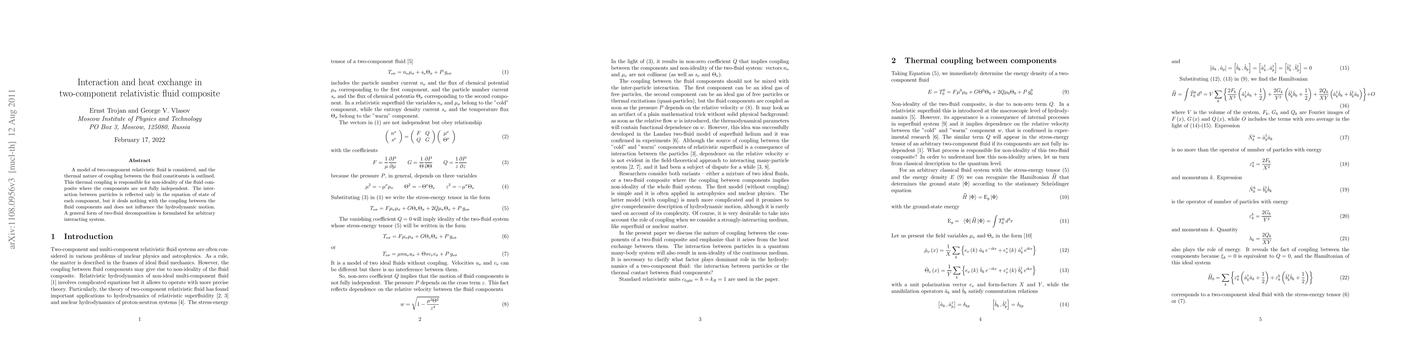 A model of two-component relativistic fluid is considered, and the thermal nature of coupling between the fluid constituents is outlined. This thermal coupling is responsible for non-ideality of the fluid composite where the components are not fully independent. The interaction between particles is reflected only in the equation of state of each component, but it deals nothing with the coupling between the fluid components and does not influence the hydrodynamic motion. A general form of two-fluid decomposition is formulated for arbitrary interacting system.