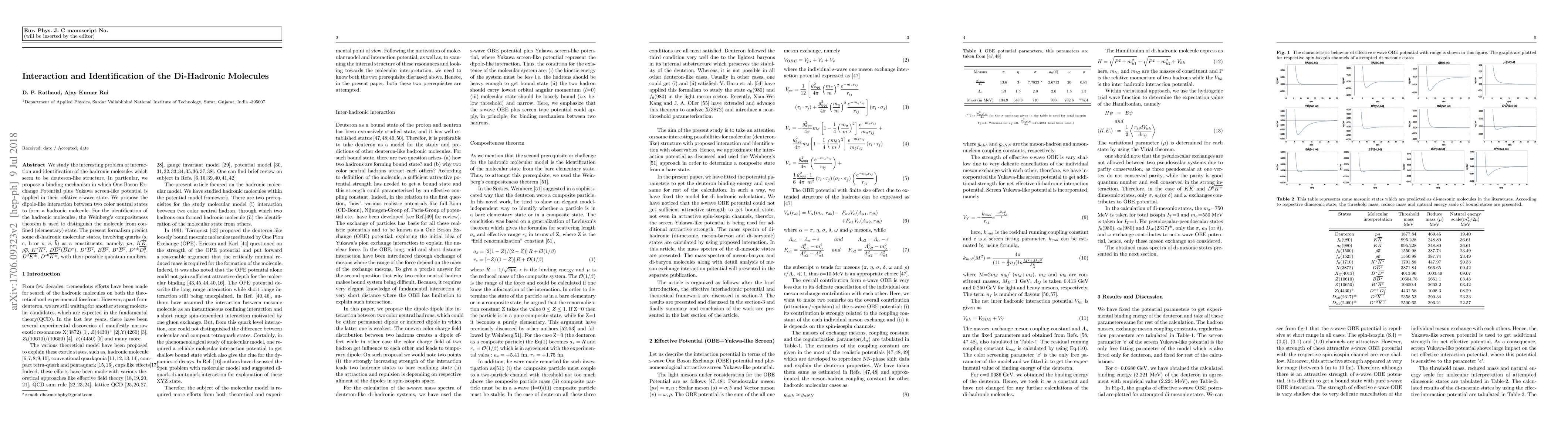 We study the interesting problem of interaction and identification of the hadronic molecules which seem to be deuteron-like structure. In particular, we propose a binding mechanism in which One Boson Exchange Potential plus Yukawa screen-like potential is applied in their relative s-wave state. We propose the dipole-like interaction between two color neutral states to form a hadronic molecule. For the identification of the hadronic molecules, the Weinberg's compositeness theorem is used to distinguish the molecule from confined (elementary) state. The present formalism predict some di-hadronic molecular states, involving quarks (s, c, b or $\overline{s}$, $\overline{c}$, $\overline{b}$) as a constituents, namely, $pn$, $K\overline{K}$, $\rho \overline{\rho}$, $K^{*}\overline{K^{*}}$, $D\overline{D^{*}}$($\overline{D}D^{*}$), $D^{*}\overline{D^{*}}$, $B\overline{B^{*}}$, $B^{*}\overline{B^{*}}$, $D^{*\pm}\overline{D_{1}^{0}}$, $ D^{0}\overline{K^{\pm}}$, $D^{*0}\overline{K^{\pm}}$, with their possible quantum numbers.