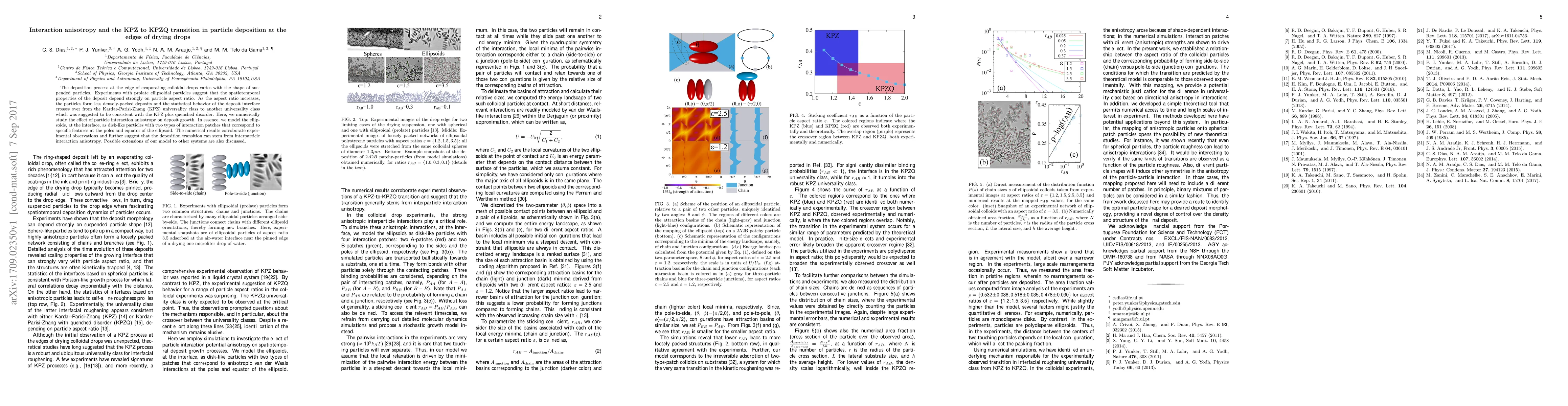 The deposition process at the edge of evaporating colloidal drops varies with the shape of suspended particles. Experiments with prolate ellipsoidal particles suggest that the spatiotemporal properties of the deposit depend strongly on particle aspect ratio. As the aspect ratio increases, the particles form less densely-packed deposits and the statistical behavior of the deposit interface crosses over from the Kardar-Parisi-Zhang (KPZ) universality class to another universality class which was suggested to be consistent with the KPZ plus quenched disorder. Here, we numerically study the effect of particle interaction anisotropy on deposit growth. In essence, we model the ellipsoids, at the interface, as disk-like particles with two types of interaction patches that correspond to specific features at the poles and equator of the ellipsoid. The numerical results corroborate experimental observations and further suggest that the deposition transition can stem from interparticle interaction anisotropy. Possible extensions of our model to other systems are also discussed.