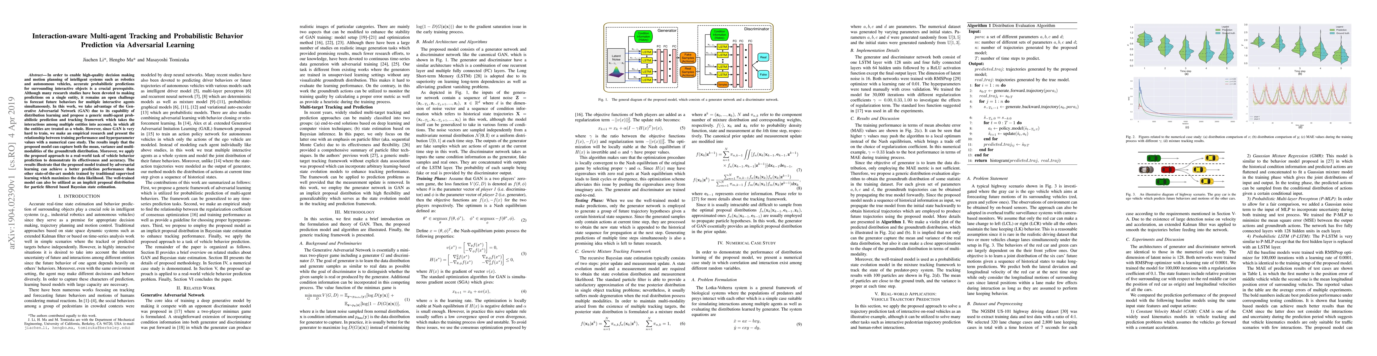 In order to enable high-quality decision making and motion planning of intelligent systems such as robotics and autonomous vehicles, accurate probabilistic predictions for surrounding interactive objects is a crucial prerequisite. Although many research studies have been devoted to making predictions on a single entity, it remains an open challenge to forecast future behaviors for multiple interactive agents simultaneously. In this work, we take advantage of the Generative Adversarial Network (GAN) due to its capability of distribution learning and propose a generic multi-agent probabilistic prediction and tracking framework which takes the interactions among multiple entities into account, in which all the entities are treated as a whole. However, since GAN is very hard to train, we make an empirical research and present the relationship between training performance and hyperparameter values with a numerical case study. The results imply that the proposed model can capture both the mean, variance and multi-modalities of the groundtruth distribution. Moreover, we apply the proposed approach to a real-world task of vehicle behavior prediction to demonstrate its effectiveness and accuracy. The results illustrate that the proposed model trained by adversarial learning can achieve a better prediction performance than other state-of-the-art models trained by traditional supervised learning which maximizes the data likelihood. The well-trained model can also be utilized as an implicit proposal distribution for particle filtered based Bayesian state estimation.