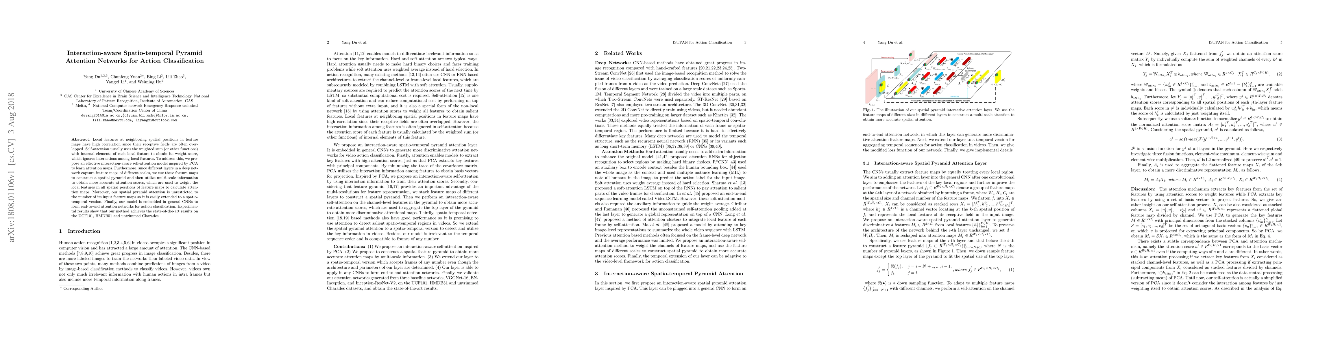 Local features at neighboring spatial positions in feature maps have high correlation since their receptive fields are often overlapped. Self-attention usually uses the weighted sum (or other functions) with internal elements of each local feature to obtain its weight score, which ignores interactions among local features. To address this, we propose an effective interaction-aware self-attention model inspired by PCA to learn attention maps. Furthermore, since different layers in a deep network capture feature maps of different scales, we use these feature maps to construct a spatial pyramid and then utilize multi-scale information to obtain more accurate attention scores, which are used to weight the local features in all spatial positions of feature maps to calculate attention maps. Moreover, our spatial pyramid attention is unrestricted to the number of its input feature maps so it is easily extended to a spatio-temporal version. Finally, our model is embedded in general CNNs to form end-to-end attention networks for action classification. Experimental results show that our method achieves the state-of-the-art results on the UCF101, HMDB51 and untrimmed Charades.