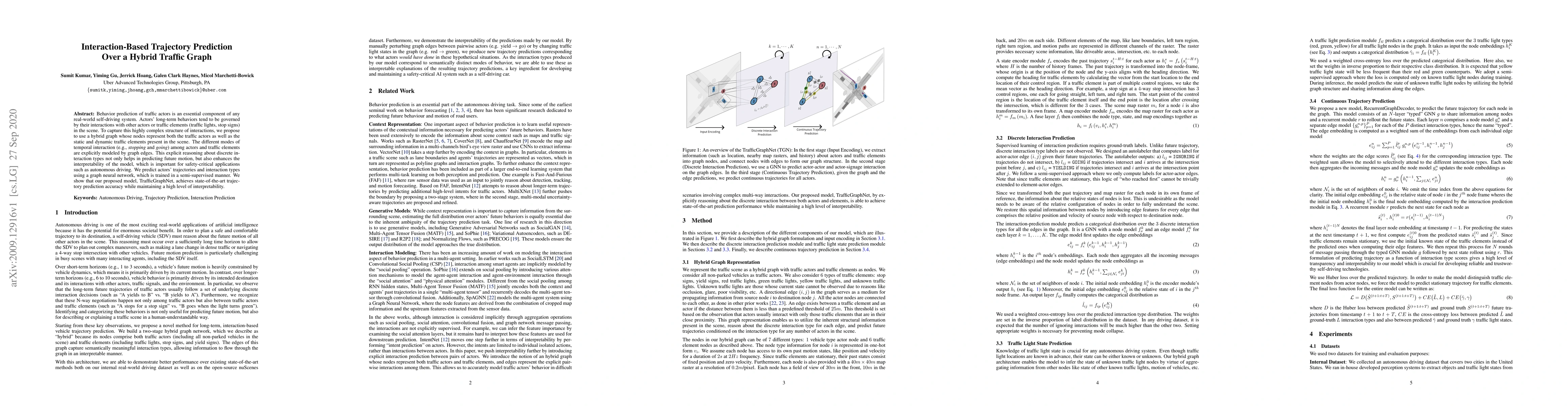 Behavior prediction of traffic actors is an essential component of any real-world self-driving system. Actors' long-term behaviors tend to be governed by their interactions with other actors or traffic elements (traffic lights, stop signs) in the scene. To capture this highly complex structure of interactions, we propose to use a hybrid graph whose nodes represent both the traffic actors as well as the static and dynamic traffic elements present in the scene. The different modes of temporal interaction (e.g., stopping and going) among actors and traffic elements are explicitly modeled by graph edges. This explicit reasoning about discrete interaction types not only helps in predicting future motion, but also enhances the interpretability of the model, which is important for safety-critical applications such as autonomous driving. We predict actors' trajectories and interaction types using a graph neural network, which is trained in a semi-supervised manner. We show that our proposed model, TrafficGraphNet, achieves state-of-the-art trajectory prediction accuracy while maintaining a high level of interpretability.