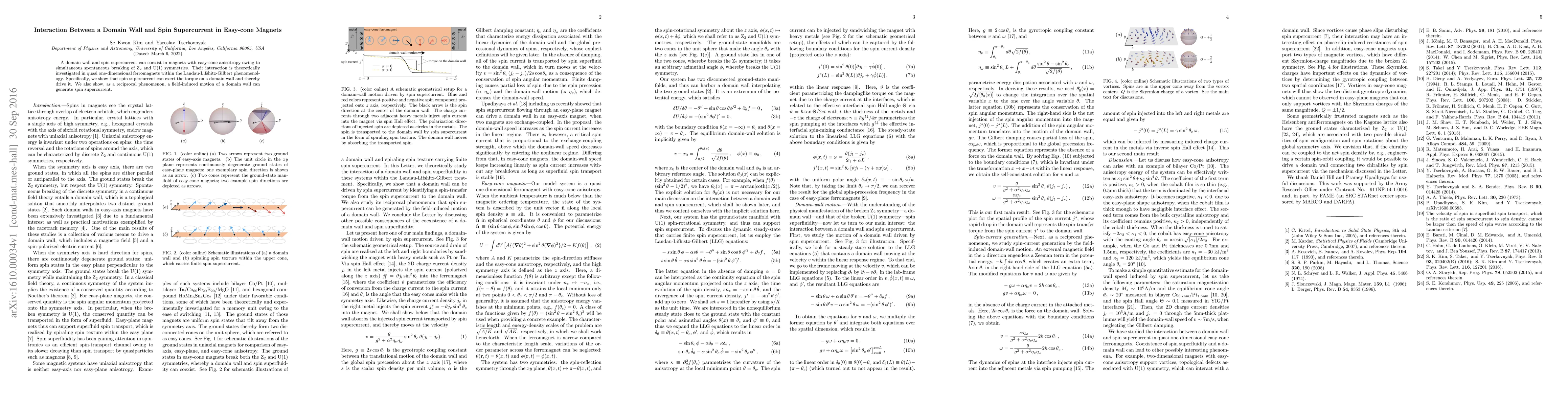 This paper investigates the interaction between a domain wall and spin supercurrent in magnets with easy-cone anisotropy, demonstrating that spin supercurrent can drive the motion of a domain wall, and conversely, a moving domain wall can generate spin supercurrent, using Landau-Lifshitz-Gilbert phenomenology.