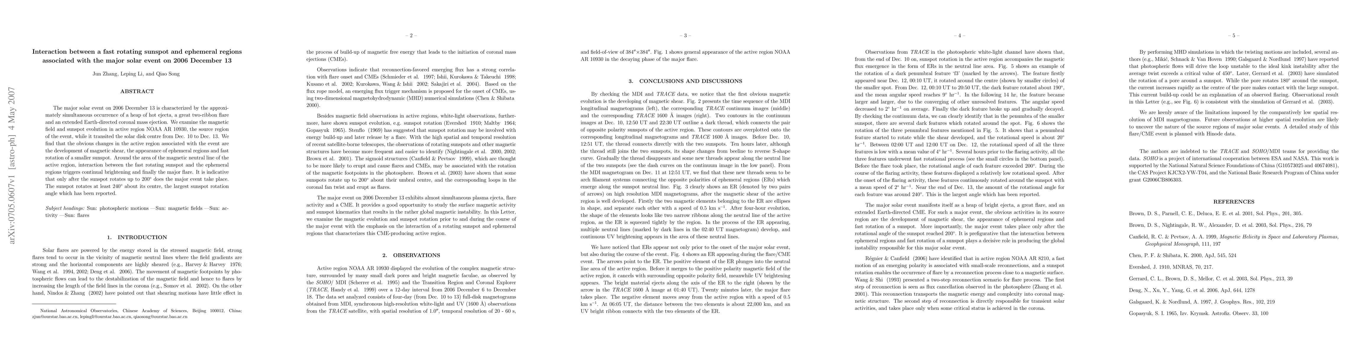 This paper investigates the major solar event on December 13, 2006, attributing it to the interaction between a rapidly rotating sunspot and ephemeral regions in active region NOAA AR 10930, which culminated in a significant flare and coronal mass ejection. The sunspot's rotation of at least 240° is the largest rotation angle recorded.