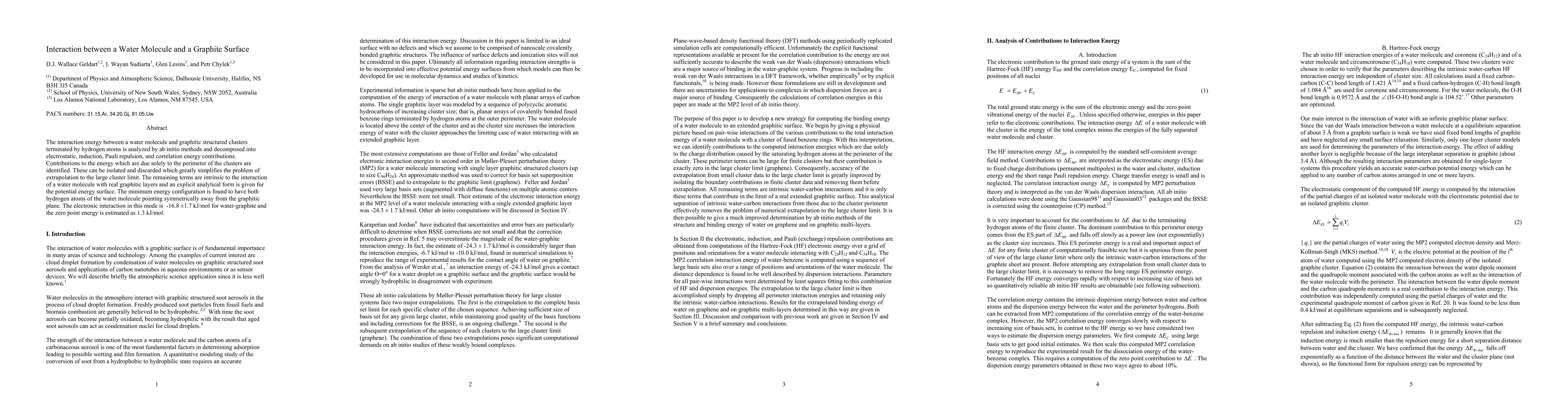 The interaction energy between a water molecule and graphitic structured clusters terminated by hydrogen atoms is analyzed by ab initio methods and decomposed into electrostatic, induction, Pauli repulsion, and correlation energy contributions. Contributions to the energy which are due solely to the perimeter of the clusters are identified. These can be isolated and discarded which greatly simplifies the problem of extrapolation to the large cluster limit. The remaining terms are intrinsic to the interaction of a water molecule with real graphitic layers and an explicit analytical form is given for the potential energy surface. The minimum energy configuration is found to have both hydrogen atoms of the water molecule pointing symmetrically away from the graphitic plane. The electronic interaction in this mode is -16.8 +/- 1.7 kJ/mol for water-graphite and the zero point energy is estimated as 1.3 kJ/mol.