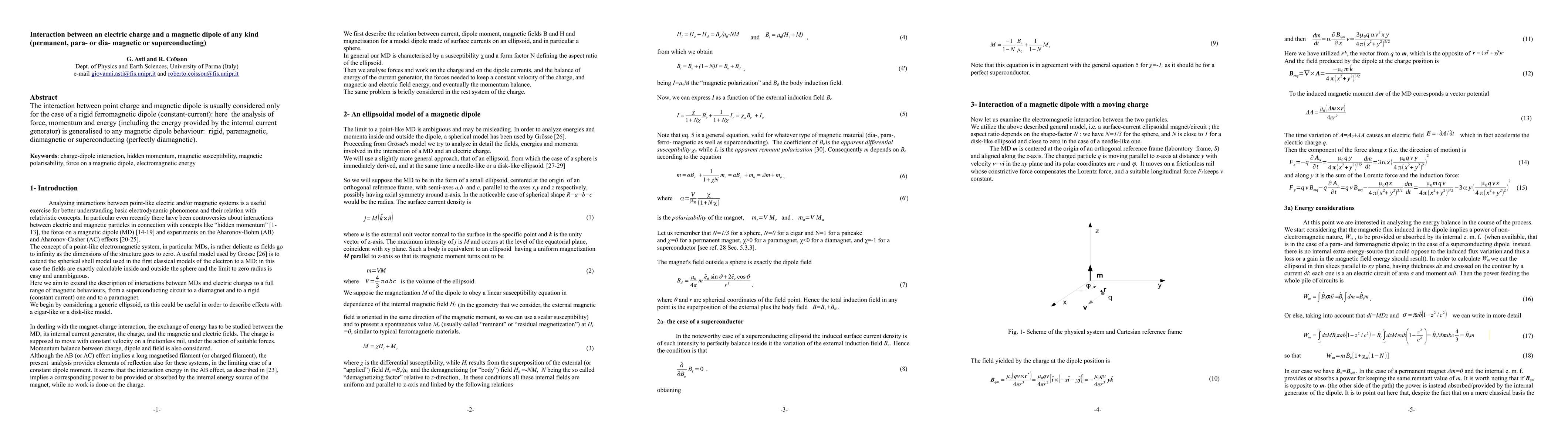 The interaction between point charge and magnetic dipole is usually considered only for the case of a rigid ferromagnetic dipole (constant-current): here the analysis of force, momentum and energy (including the energy provided by the internal current generator) is generalised to any magnetic dipole behaviour: rigid, paramagnetic, diamagnetic or superconducting (perfectly diamagnetic).