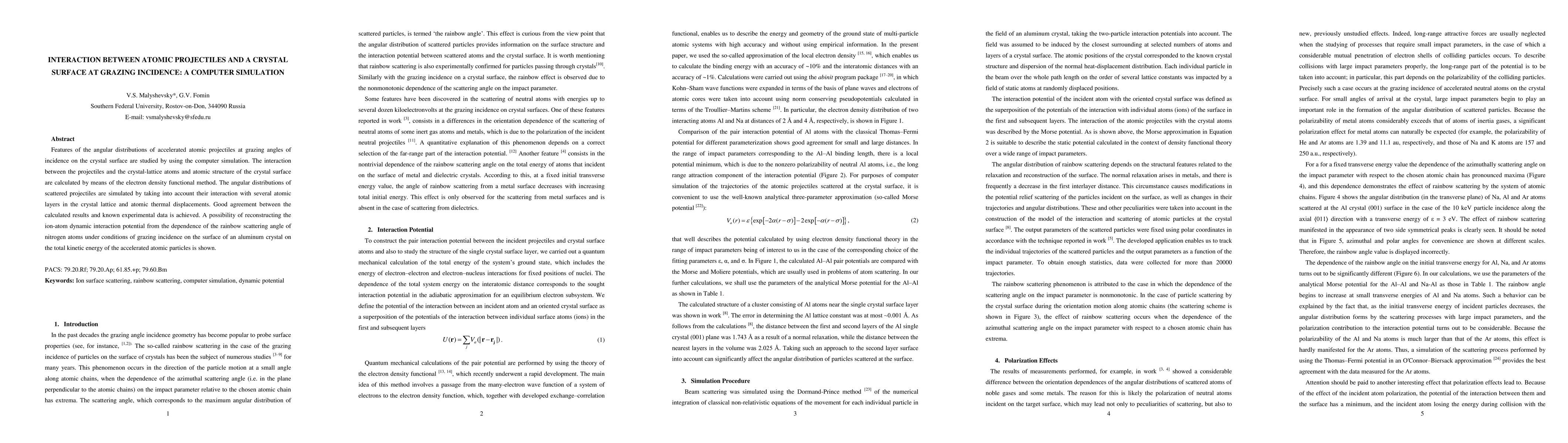 This research uses computer simulation to study atomic projectiles' angular distributions at grazing angles on a crystal surface, employing the electron density functional method. It successfully reproduces experimental data and demonstrates the potential to reconstruct ion-atom interaction potentials from rainbow scattering angles.
