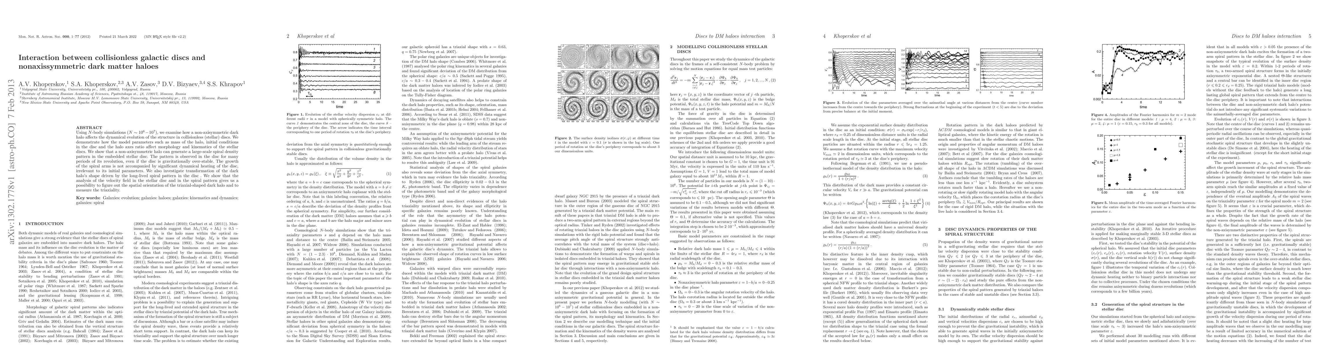 Using $N$-body simulations ($N\sim 10^6 - 10^7$), we examine how a non-axisymmetric dark halo affects the dynamical evolution of the structure in collisionless (stellar) discs. We demonstrate how the model parameters such as mass of the halo, initial conditions in the disc and the halo axes ratio affect morphology and kinematics of the stellar discs. We show that a non-axisymmetric halo can generate a large-scale spiral density pattern in the embedded stellar disc. The pattern is observed in the disc for many periods of its revolution, even if the disc is gravitationally over-stable. The growth of the spiral arms is not accompanied by significant dynamical heating of the disc, irrelevant to its initial parameters. We also investigate transformation of the dark halo's shape driven by the long-lived spiral pattern in the disc . We show that the analysis of the velocity field in the stellar disc and in the spiral pattern gives us a possibility to figure out the spatial orientation of the triaxial-shaped dark halo and to measure the triaxiality.