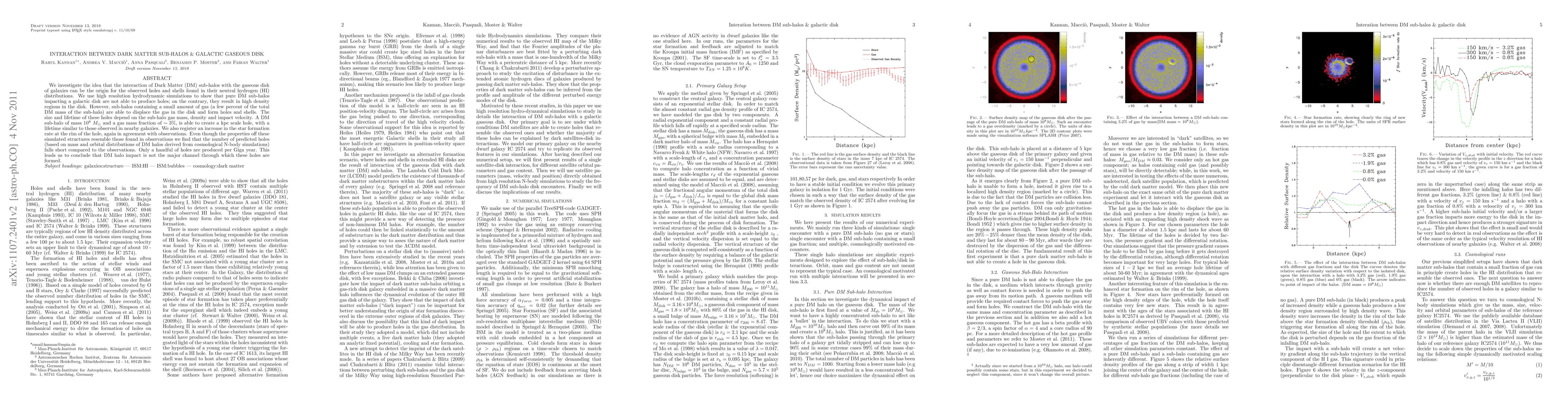 This study uses high-resolution simulations to explore how dark matter sub-halos interacting with galactic gaseous disks can create holes and shells in neutral hydrogen distributions. While pure DM sub-halos do not produce holes, those with a small gas component can displace gas and form structures resembling observed features, though the predicted number of such holes is much lower than observed.