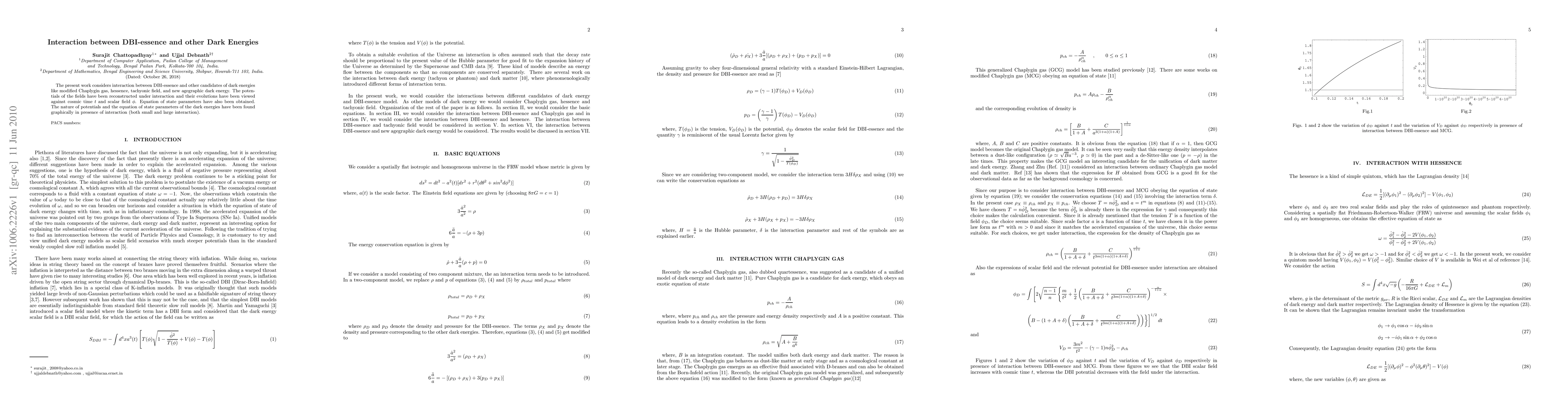 The present work considers interaction between DBI-essence and other candidates of dark energies like modified Chaplygin gas, hessence, tachyonic field, and new agegraphic dark energy. The potentials of the fields have been reconstructed under interaction and their evolutions have been viewed against cosmic time $t$ and scalar field $\phi$. Equation of state parameters have also been obtained. The nature of potentials and the equation of state parameters of the dark energies have been found graphically in presence of interaction (both small and large interaction).