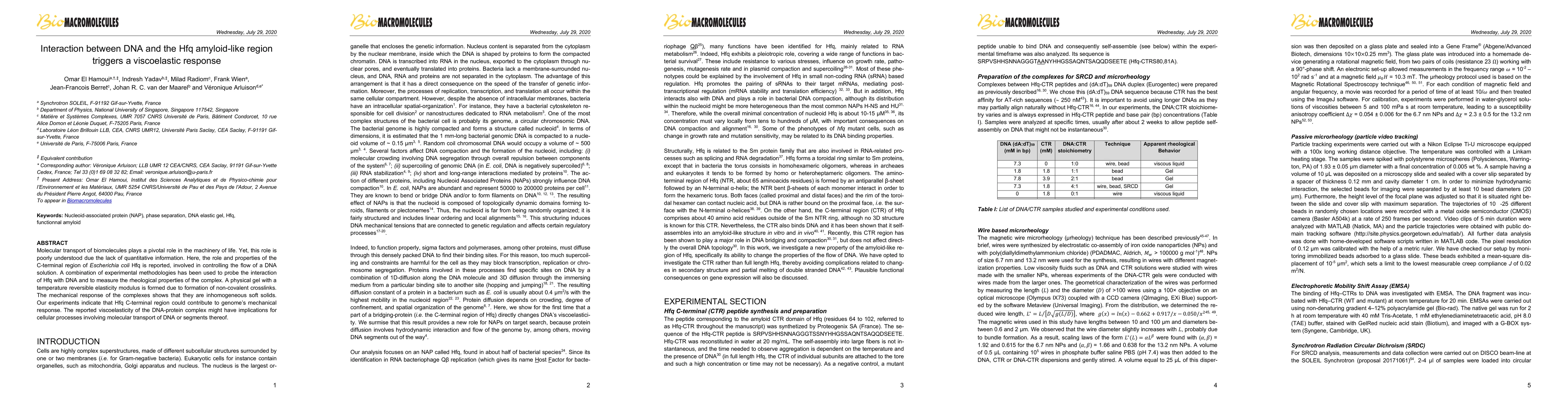 This paper investigates the interaction between the Hfq protein's C-terminal region and DNA, revealing a viscoelastic response due to the formation of non-covalent crosslinks. The study suggests that this interaction could influence the mechanical properties of the genome, potentially impacting cellular processes involving DNA transport.