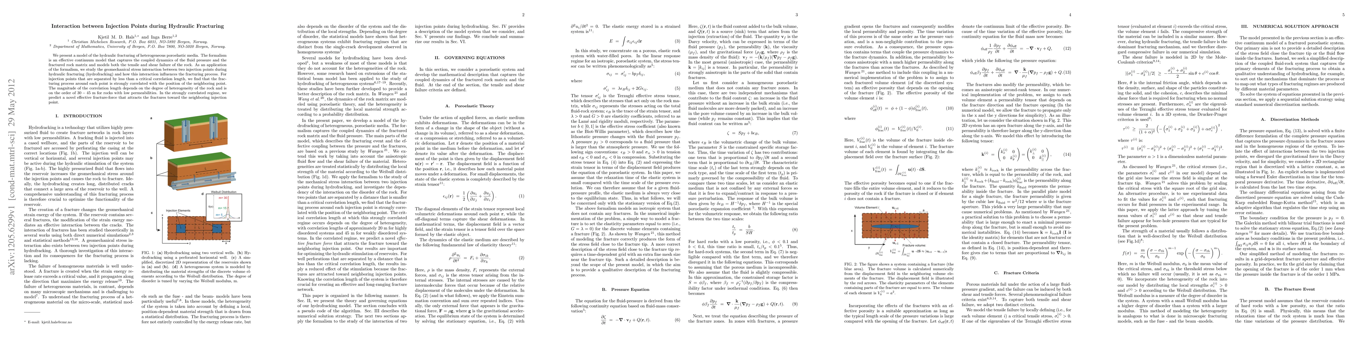 We present a model of the hydraulic fracturing of heterogeneous poroelastic media. The formalism is an effective continuum model that captures the coupled dynamics of the fluid pressure and the fractured rock matrix and models both the tensile and shear failure of the rock. As an application of the formalism, we study the geomechanical stress interaction between two injection points during hydraulic fracturing (hydrofracking) and how this interaction influences the fracturing process. For injection points that are separated by less than a critical correlation length, we find that the fracturing process around each point is strongly correlated with the position of the neighboring point. The magnitude of the correlation length depends on the degree of heterogeneity of the rock and is on the order of 30-45 m for rocks with low permeabilities. In the strongly correlated regime, we predict a novel effective fracture-force that attracts the fractures toward the neighboring injection point.