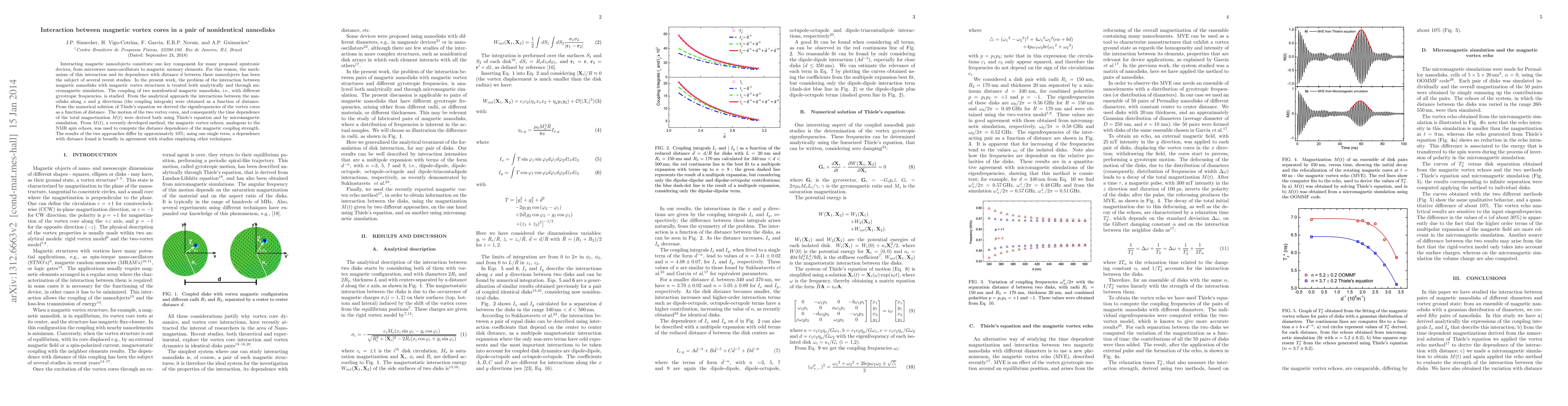 Interacting magnetic nanoobjects constitute one key component for many proposed spintronic devices, from microwave nano-oscillators to magnetic memory elements. For this reason, the mechanism of this interaction and its dependence with distance $d$ between these nanoobjects has been the subject of several recent studies. In the present work, the problem of the interaction between magnetic nanodisks with magnetic vortex structures is treated both analytically and through micromagnetic simulation. The coupling of two magnetic nanodisks is obtained, in the case of nanodisks with different gyrotropic frequencies. The motion of the two vortex cores, and consequently the time dependence of the total magnetization $M(t)$ is derived using Thiele's equation and by simulation. The magnetic coupling strength as a function of the distance between the disks of each pair is computed with a recently developed method, using the magnetic vortex echoes, analogous to the NMR spin echoes. The results of the two approaches differ by approximately $10\%$ and can be fitted with a multipolar expansion of odd negative powers of $d$; using one single term, a dependence with distance found is broadly in agreement with studies employing other techniques. The coupling frequencies as a function of distance for the pair of nonidentical disks are also obtained.