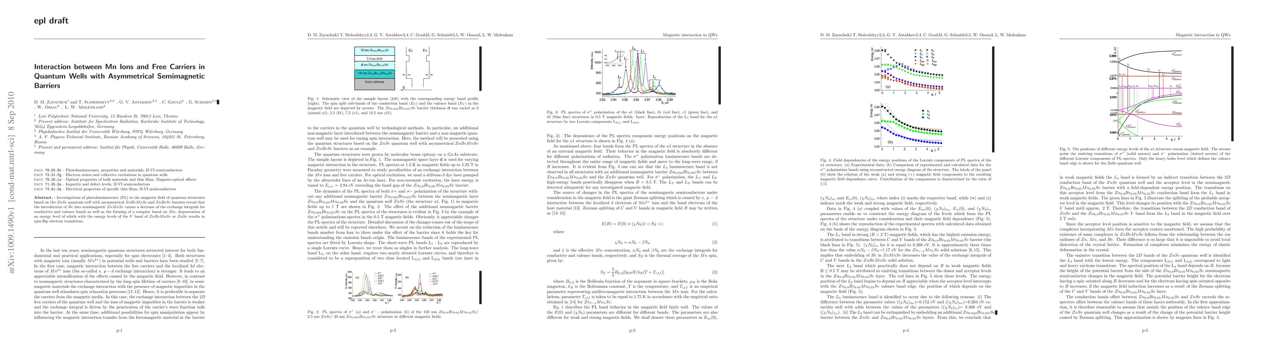 Summary: Research on ZnSe quantum wells with asymmetrical ZnBeMnSe barriers shows that beryllium incorporation reduces exchange integrals and leads to spin-flip electron transitions via complex formation between Mn ions and free carriers. The study utilizes photoluminescence analysis in magnetic fields to uncover these interactions.