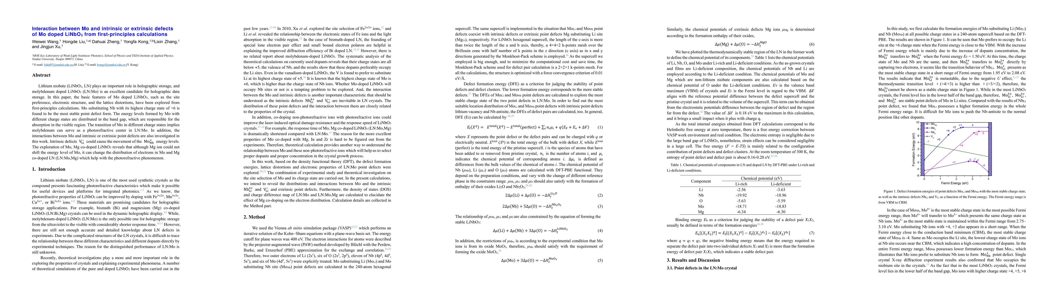This paper investigates the interaction of molybdenum (Mo) doping in lithium niobate (LiNbO$_3$, LN) using first-principles calculations, finding Mo substituting Nb as the most stable defect. The study reveals Mo's role as a photorefractive center and explores its interaction with intrinsic and extrinsic defects, showing that intrinsic $\tt V_{Li}^-$ can shift Mo energy levels while Mg co-doping modifies electron distribution.