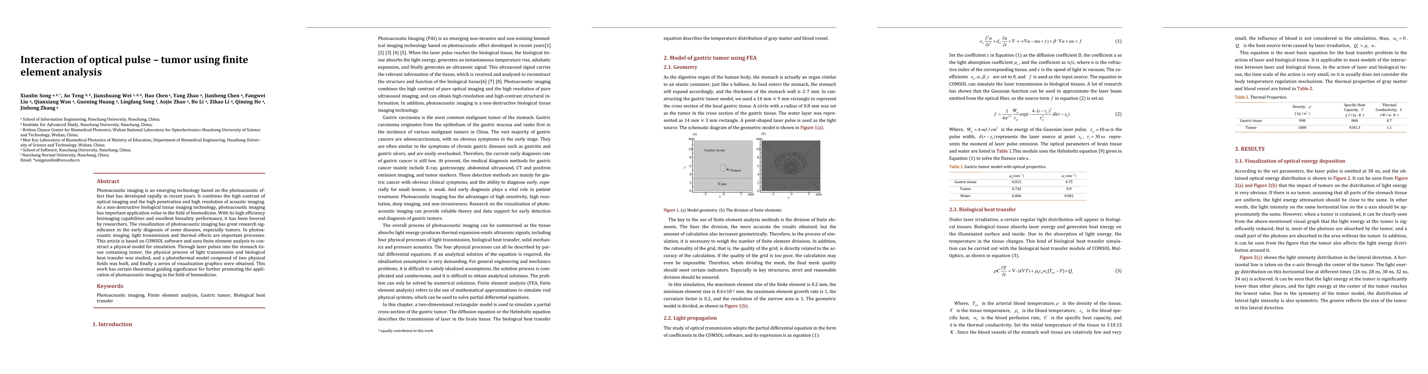 Photoacoustic imaging is an emerging technology based on the photoacoustic effect that has developed rapidly in recent years. It combines the high contrast of optical imaging and the high penetration and high resolution of acoustic imaging. As a non-destructive biological tissue imaging technology, photoacoustic imaging has important application value in the field of biomedicine. With its high efficiency bi-oimaging capabilities and excellent biosafety performance, it has been favored by researchers. The visualization of photoacoustic imaging has great research signifi-cance in the early diagnosis of some diseases, especially tumors. In photoacoustic imaging, light transmission and thermal effects are important processes. This article is based on COMSOL software and uses finite element analysis to construct a physi-cal model for simulation. Through laser pulses into the stomach tissue containing tumor, the physical process of light transmission and biological heat transfer was studied, and a photothermal model composed of two physical fields was built, and finally a series of visualization graphics were obtained. This work has certain theo-retical guiding significance for further promoting the application of photoacoustic imaging in the field of biomedicine.