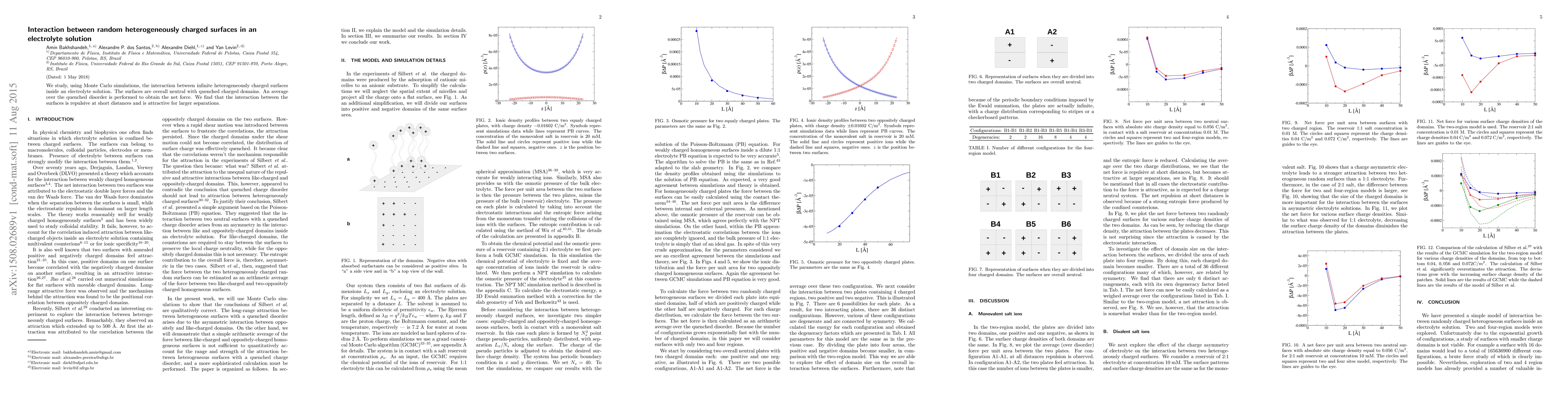 Summary: The Monte Carlo simulations reveal that randomly charged surfaces in an electrolyte solution exhibit repulsive forces at short distances and attractive forces at larger separations, due to the quenched disorder in charged domains.