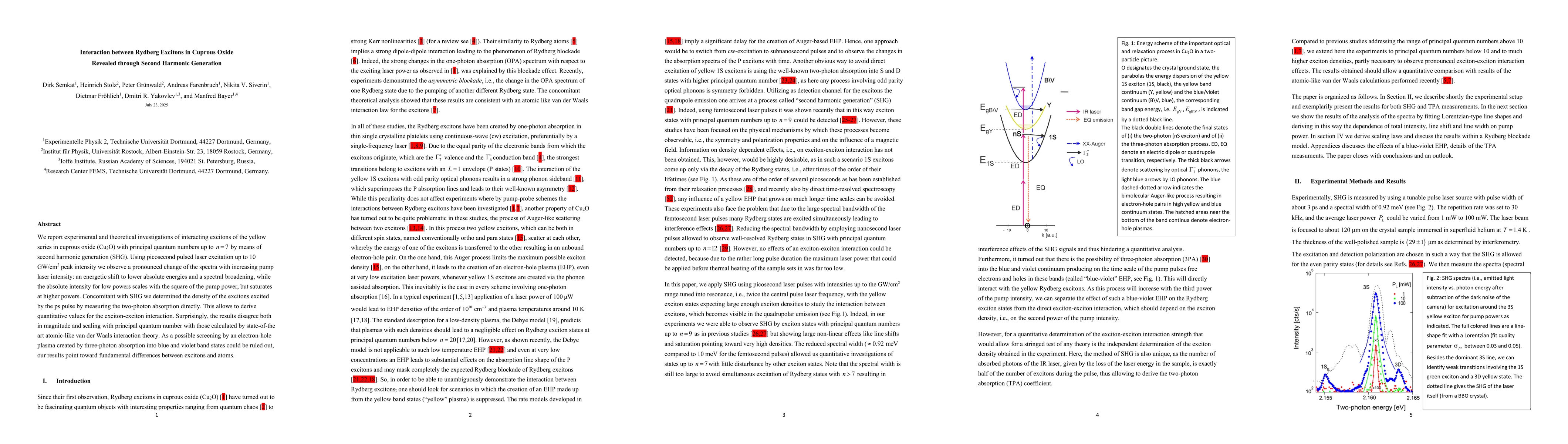 We report experimental and theoretical investigations of interacting excitons of the yellow series in cuprous oxide (Cu$_2$O) with principal quantum numbers up to $n=7$ by means of second harmonic generation (SHG). Using picosecond pulsed laser excitation up to 10 GW/cm$^2$ peak intensity we observe a pronounced change of the spectra with increasing pump laser intensity: an energetic shift to lower absolute energies and a spectral broadening, while the absolute intensity for low powers scales with the square of the pump power, but saturates at higher powers. Concomitant with SHG we determined the density of the excitons excited by the ps pulse by measuring the two-photon absorption directly. This allows to derive quantitative values for the exciton-exciton interaction. Surprisingly, the results disagree both in magnitude and scaling with principal quantum number with those calculated by state-of-the art atomic-like van der Waals interaction theory. As a possible screening by an electron-hole plasma created by three-photon absorption into blue and violet band states could be ruled out, our results point toward fundamental differences between excitons and atoms.