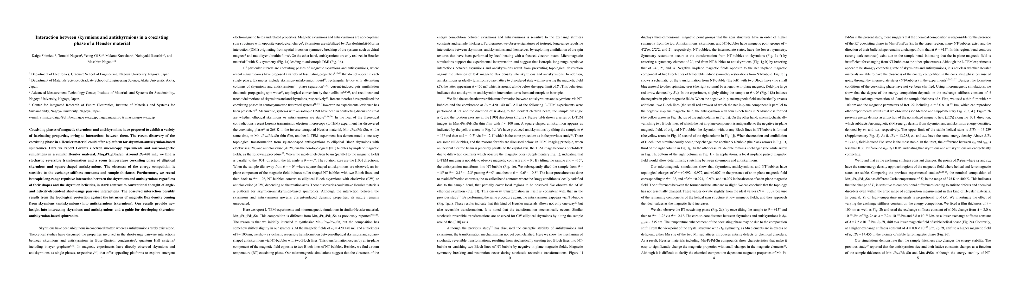 This paper investigates the interaction between skyrmions and antiskyrmions in a Heusler material, discovering a room-temperature coexisting phase of elliptical skyrmions and square-shaped antiskyrmions. The study reveals an isotropic long-range repulsive interaction between skyrmions and antiskyrmions, contrasting conventional short-range interactions, suggesting topological protection against magnetic flux density intrusion.
